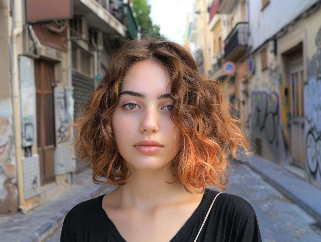 To create this look, opt for a bob cut with a rich copper hue. Add texture with a texturizing spray and scrunch your hair while drying. Keep your waves vibrant and defined with a curl-defining cream, such as Moroccan Oil Curl Defining Cream.