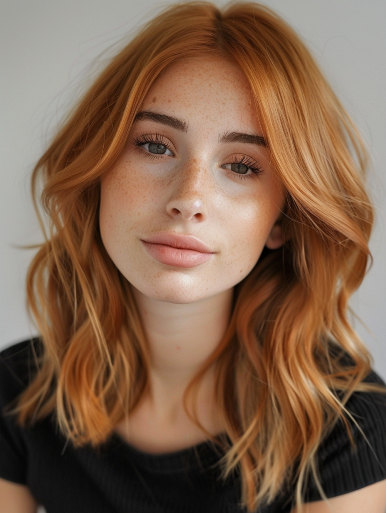 Light ginger hair with subtle highlights is a chic and understated choice that brings warmth and softness to your overall appearance. This shade is particularly flattering for individuals with pale to neutral skin tones and lighter eye colors like green or grey. It’s a versatile style that suits any occasion, from office meetings to weekend brunches, and looks stunning on longer face shapes by adding the illusion of width.