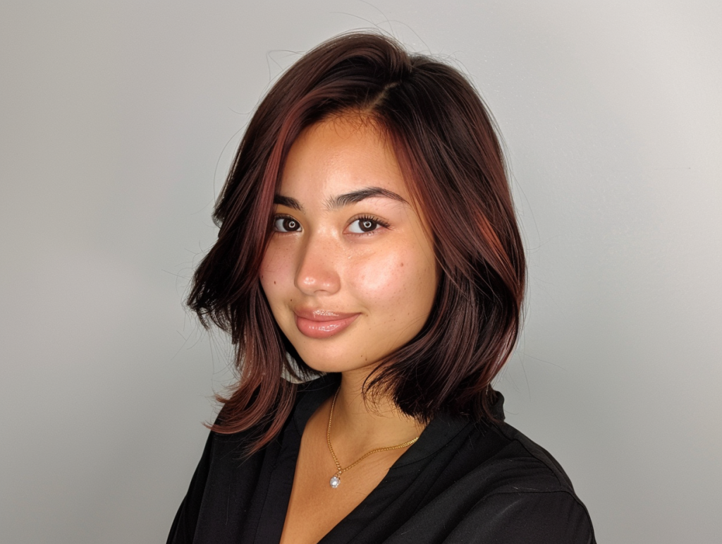 A sleek dark strawberry lob with subtle lowlights combines sophistication with a touch of mystery. This style is great for those with cooler undertones and darker eyes, offering a rich, deep hue that’s perfect for professional settings or elegant social events. It flatters rectangular and oval face shapes, providing a sleek contour that enhances facial features.