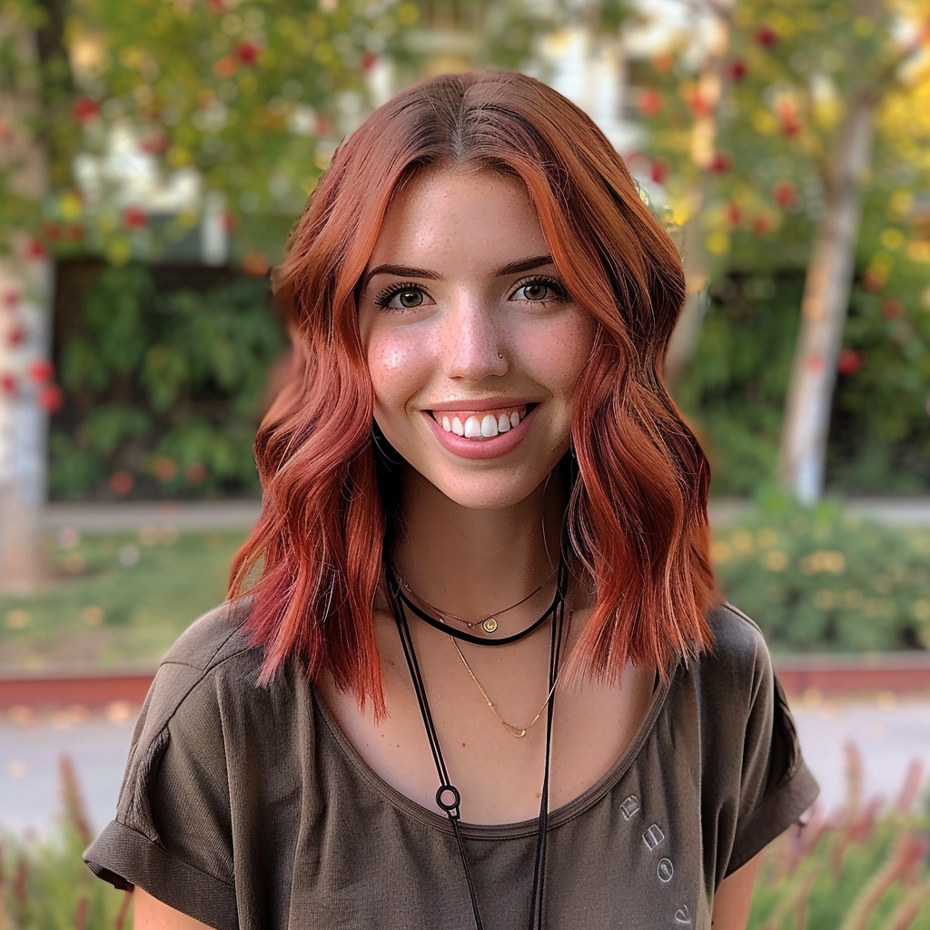 A deep copper bob with textured waves is a bold choice that radiates confidence and style. This hairstyle complements warm skin tones and makes green, brown, or blue eyes pop with its depth of color. Suitable for both casual and formal settings, it enhances round and heart-shaped faces by adding texture and volume.