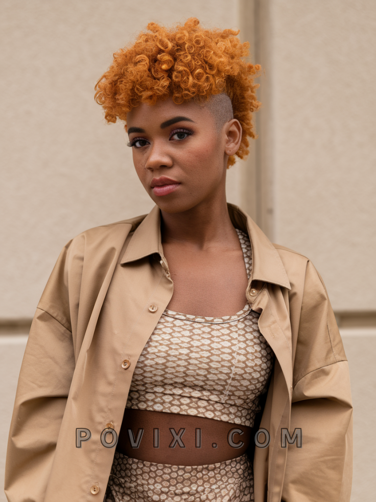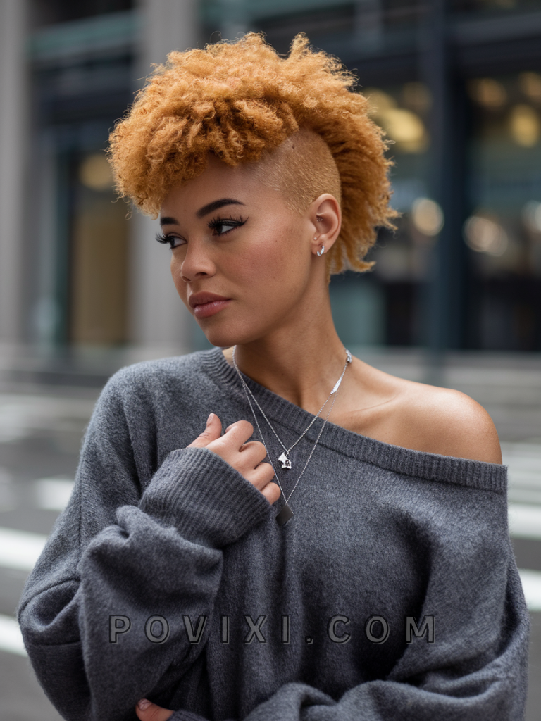 The curly ginger mohawk is for the bold at heart. This edgy yet glamorous hairstyle accentuates curly hair, blending fiery hues with striking volume. Suitable for square and oval faces, this look is perfect for concerts, parties, or creative photoshoots.