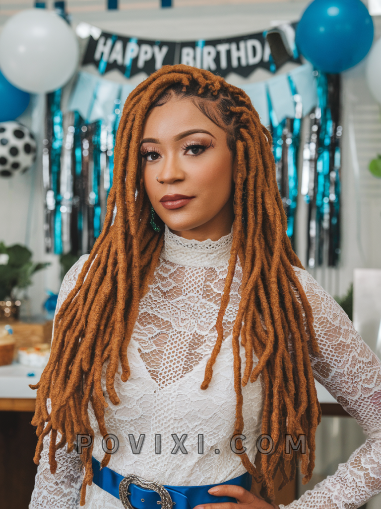 Ginger locs are a stunning way to combine rich color with a timeless, low-maintenance style. Whether you opt for traditional or faux locs, the vibrant ginger hue adds a contemporary twist. Perfect for weddings, festivals, or casual days, this style complements round and heart-shaped faces beautifully.