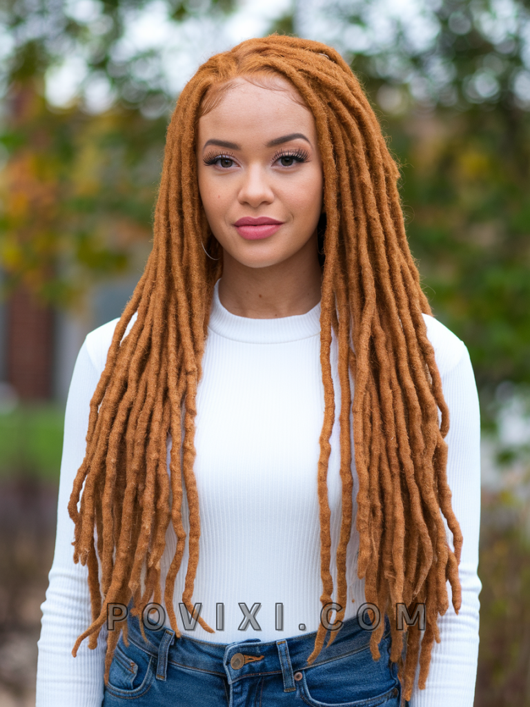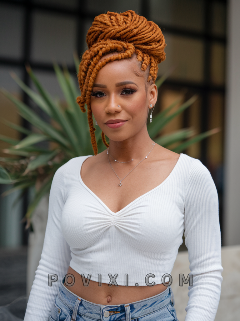 Ginger faux locs offer the best of both worlds: the protective benefits of locs combined with the head-turning appeal of a ginger hue. This style is versatile and works well for vacations or festivals where maintenance should be minimal. It beautifully complements dark skin and works with a range of face shapes, especially those with defined jawlines. This look enhances brown or green eyes, adding a touch of mystery.