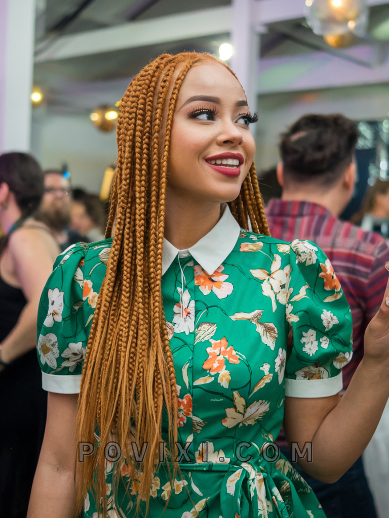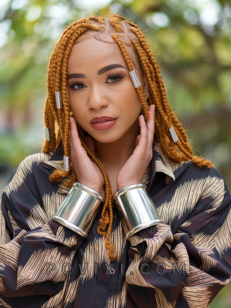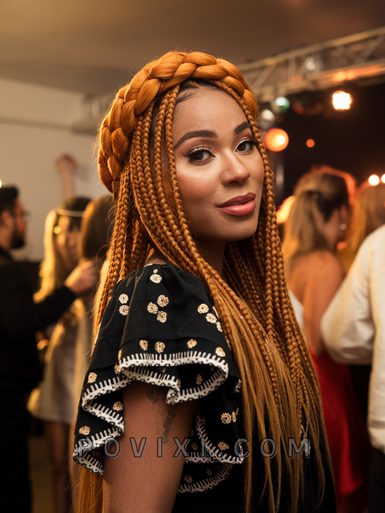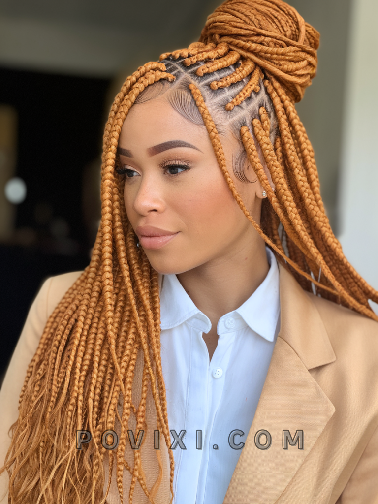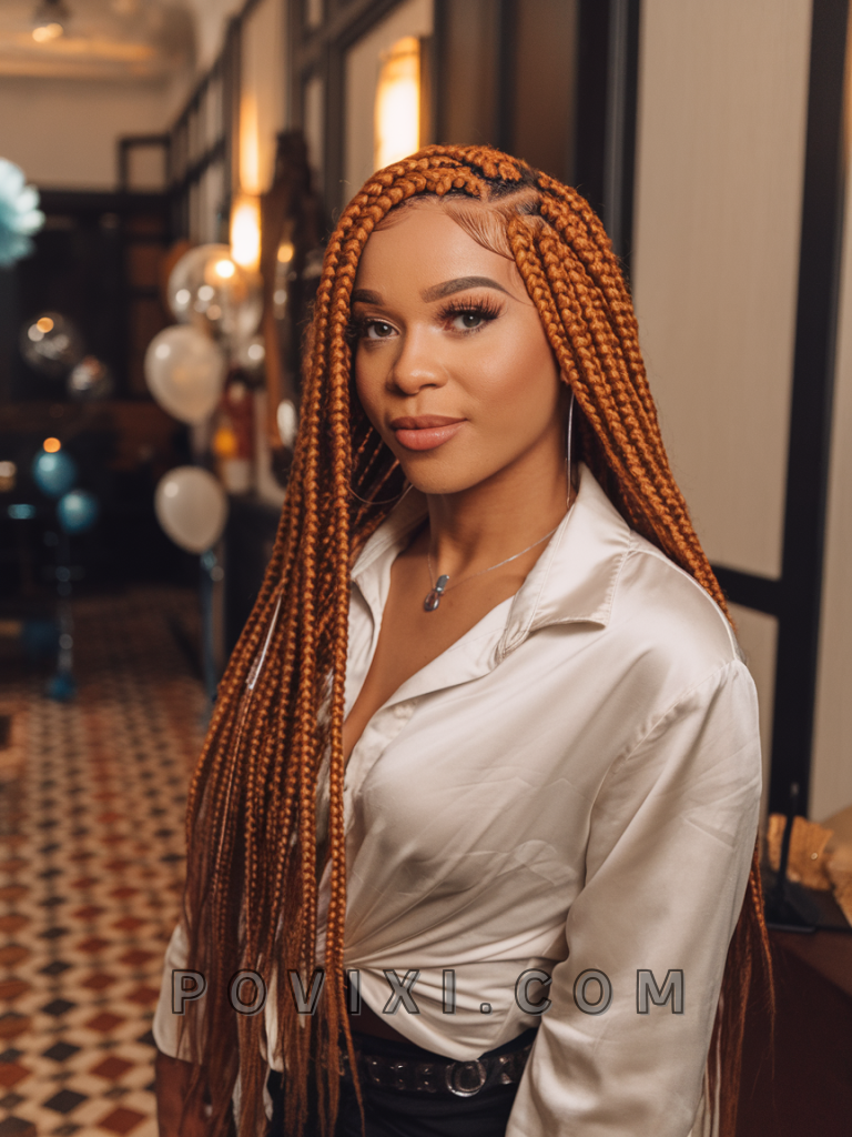 Ginger box braids are a striking style that blends tradition with modern color trends. These braids are perfect for both professional settings and social gatherings, adding a unique touch to any outfit. The style pairs beautifully with oval and round faces, and the bold ginger hue enhances eye colors from dark brown to green.