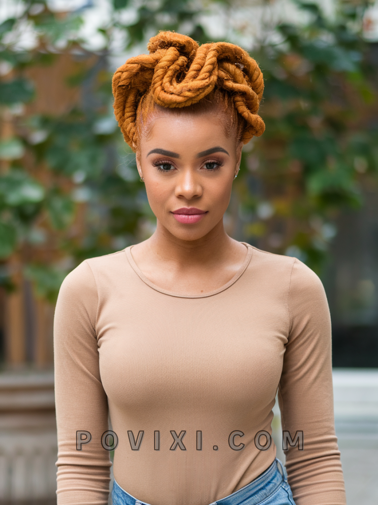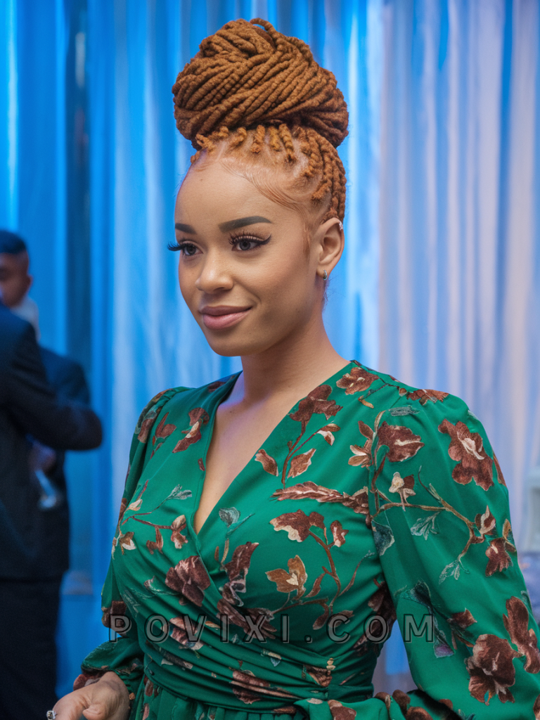 The ginger updo with twists brings together elegance and creativity. Ideal for weddings or formal events, this style combines twisted sections of hair pinned up into a graceful updo. The ginger hue adds warmth to dark skin, making it a standout choice for special occasions.
