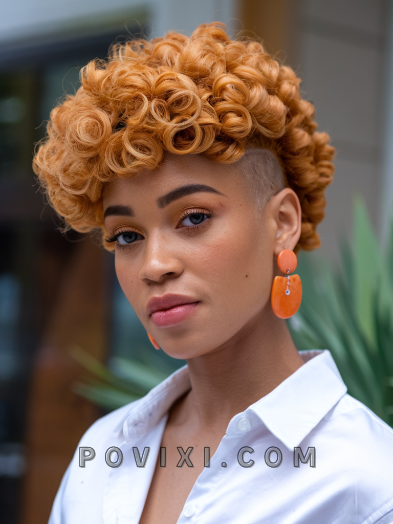 The curly frohawk with ginger highlights is a fierce and fashionable choice for those wanting to make a statement. This hairstyle is ideal for bold outings, art shows, or nightlife events. The ginger tone emphasizes curly hair, adding depth and dimension that accentuates oval and heart-shaped faces.