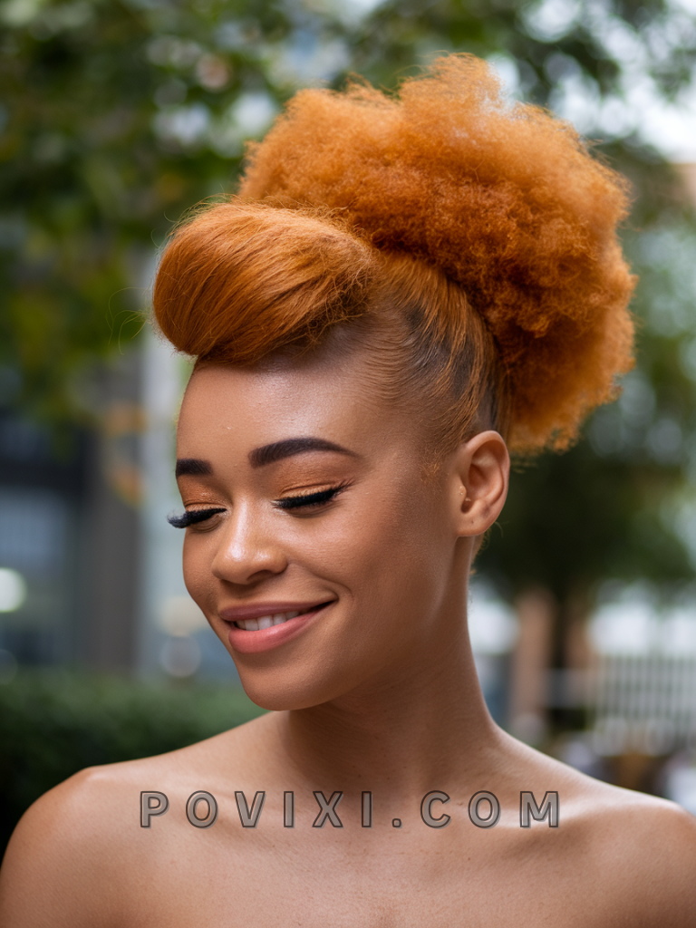 The high puff is a classic go-to for black women with curly hair looking for a blend of ease and elegance. When colored ginger, this style becomes an attention-grabber perfect for daytime outings or weekend brunches. It’s most flattering on oval and round faces and makes brown eyes pop with warmth.