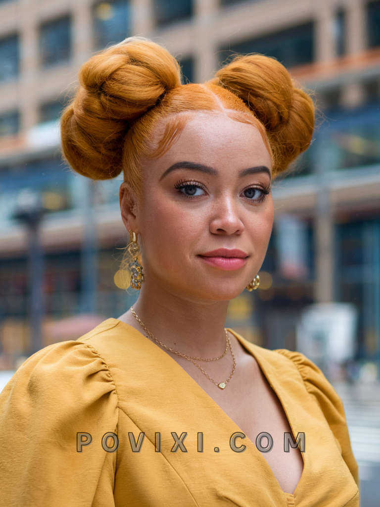 Ginger space buns offer a playful and youthful hairstyle perfect for festivals, concerts, or fun gatherings. The double bun look is trendy and adds a touch of fun to your ensemble, making it perfect for bold outfit ideas. This style suits round and square faces and enhances darker or lighter eye colors with ease.