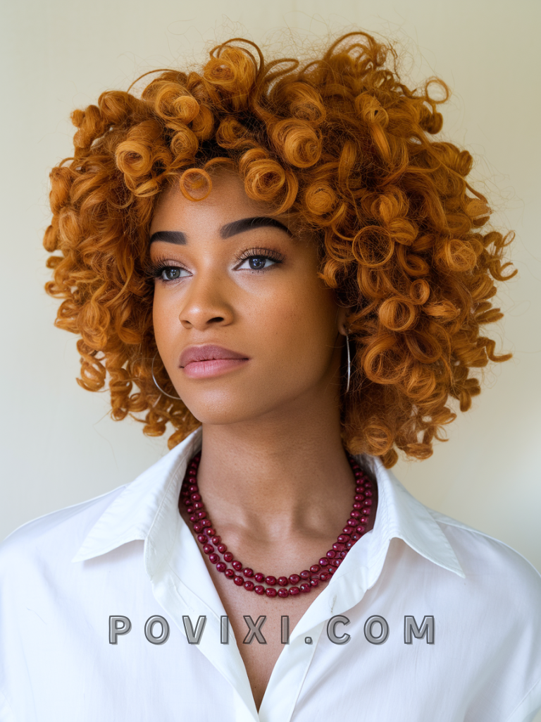Ginger afro curls are a bold yet elegant choice for black women seeking to stand out. This hairstyle embodies vibrancy and embraces natural textures, perfect for social gatherings or artistic events where you want to make a statement. The rich, warm hues of ginger complement dark skin beautifully, adding warmth and glow to the face. This style is especially stunning on oval or heart-shaped faces and pairs well with hazel or dark brown eyes, drawing attention to the eye’s natural sparkle.