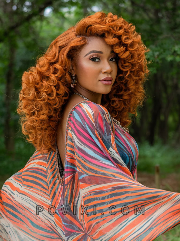 Achieving this look starts with moisturizing your natural curly hair to prevent dryness. Use a curl-enhancing cream and a diffuser to maintain volume. To retain the vivid ginger shade, try a color-protecting shampoo such as Joico’s Color Infuse Red, and incorporate a weekly deep conditioning treatment to keep the curls defined and vibrant.
