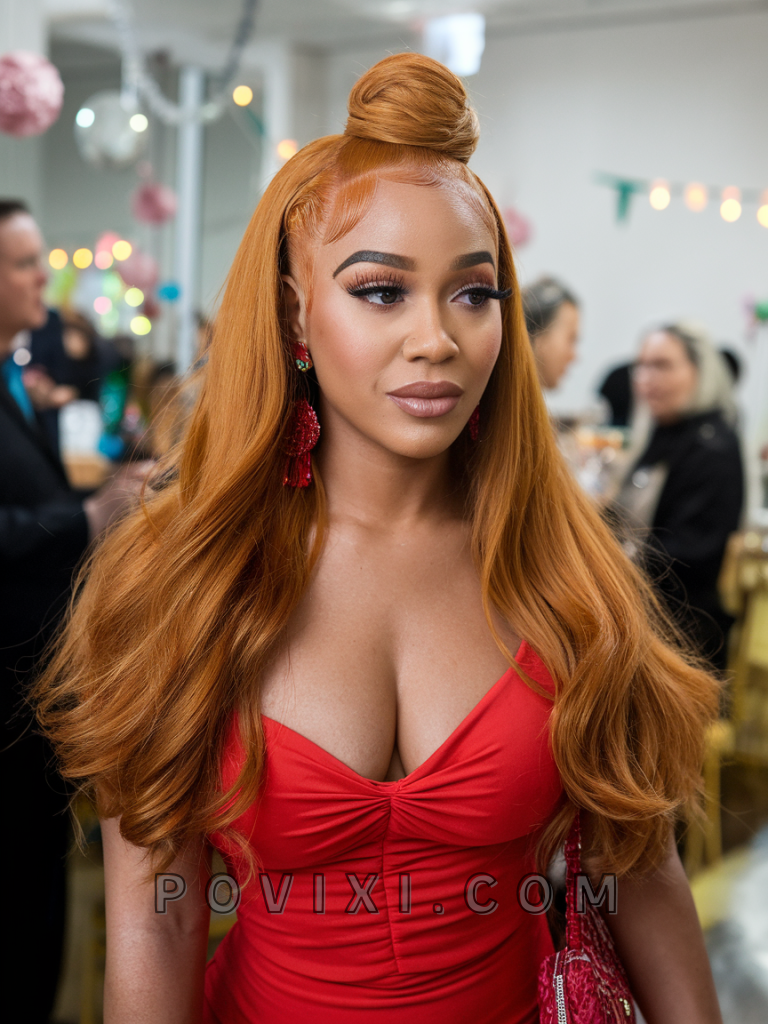To create this look, separate the top half of the hair and secure it with a clip or elastic, leaving the rest cascading down. Use a curling wand to add soft waves to the loose hair for added volume and texture. Maintain the vibrancy of the ginger color with a color-safe shampoo and touch up any roots with a temporary hair color spray.