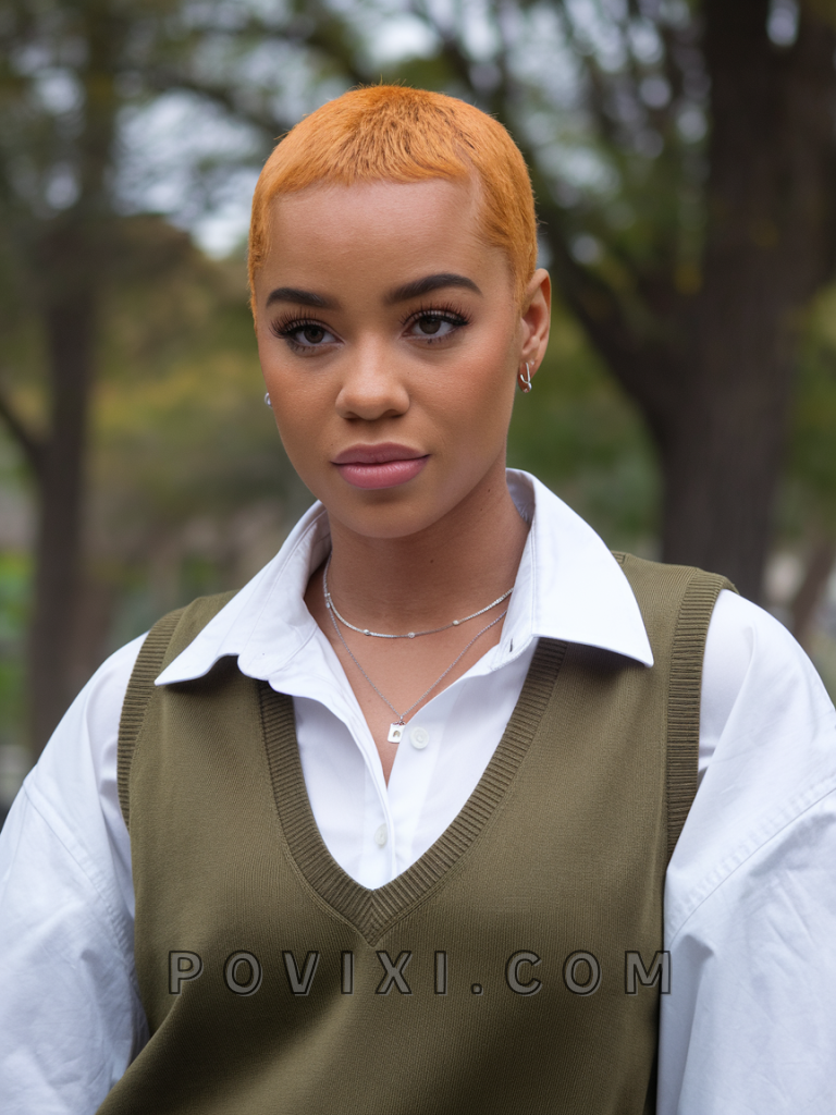 The ginger tapered cut is an edgy, fashion-forward hairstyle that showcases confidence. Ideal for women with natural short hair who want an effortlessly cool look, this cut pairs well with bold makeup and striking outfit ideas. The style is best suited for heart-shaped and oval faces, making the cheekbones and eyes stand out.