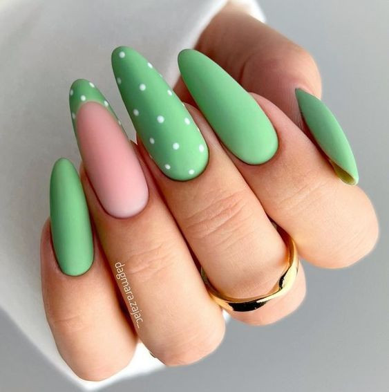 This almond-shaped acrylic design brings together a matte mint green and playful white polka dots, complemented by a subtle accent of light pink. The combination is youthful and perfect for anyone looking for a simple yet chic design. This nail style is ideal for casual brunches or springtime strolls, effortlessly elevating your overall look.