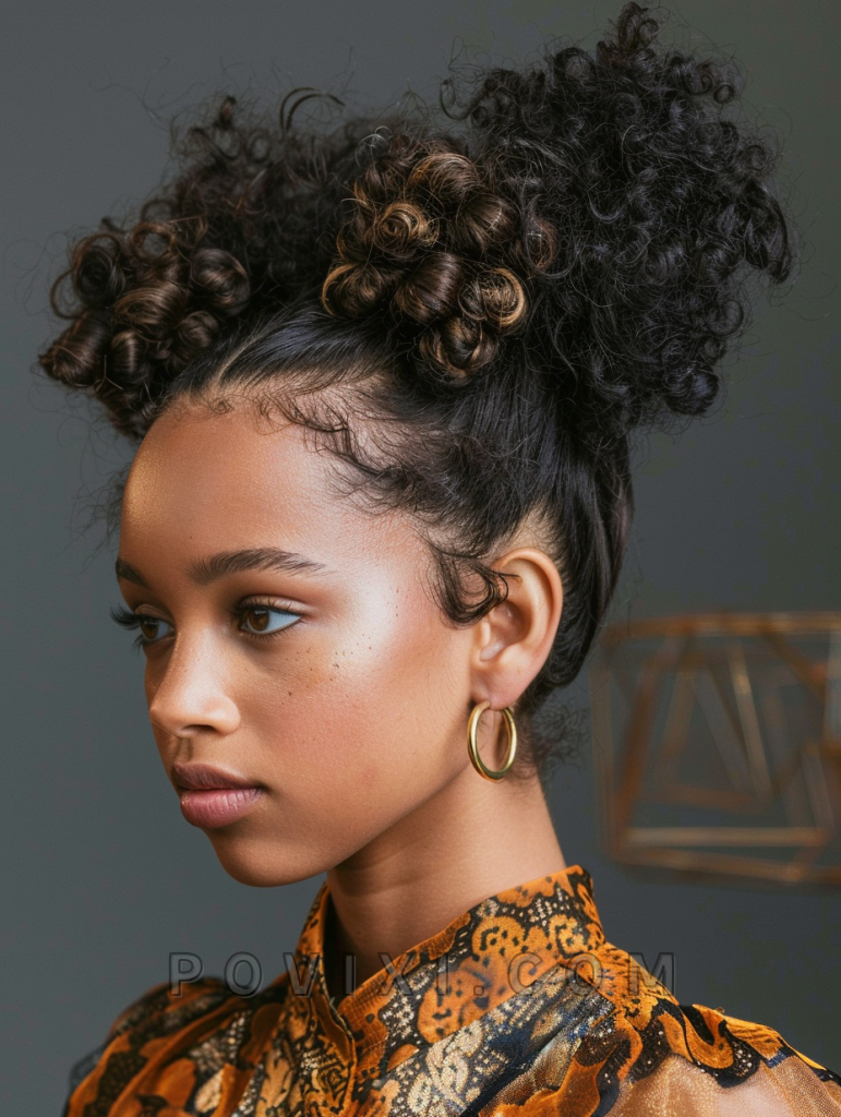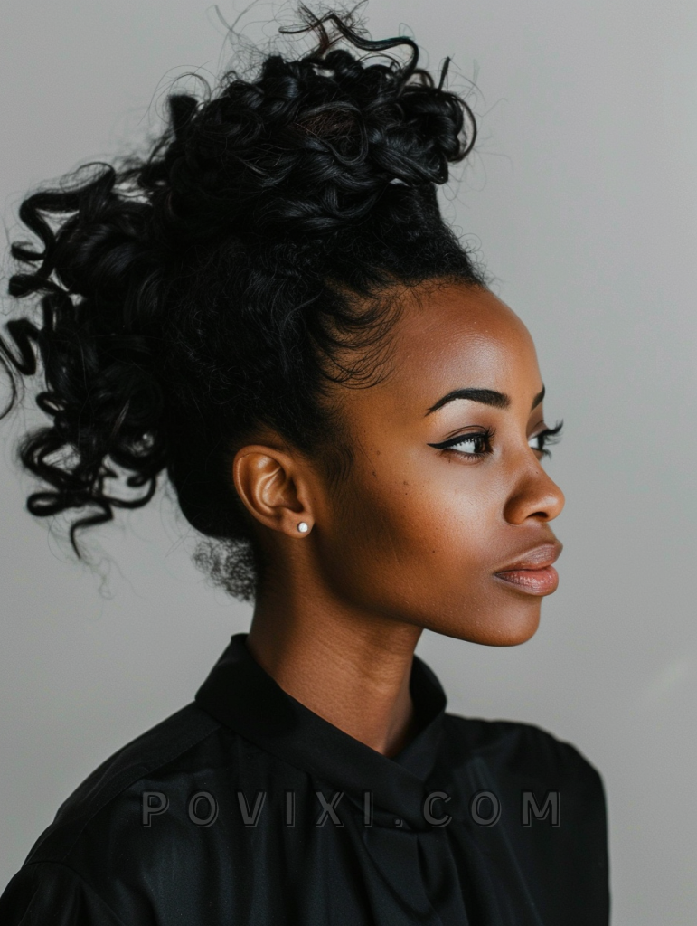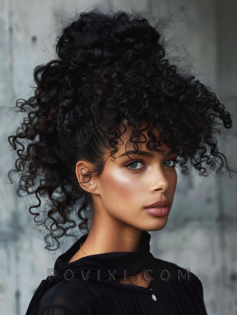 For those who love to keep their hair out of their face but still want to flaunt their curls, the Voluminous Top Knot is a stylish and practical choice. This hairstyle works best with long natural curls, creating a full, lush knot at the top of the head. It’s ideal for both formal events and casual days, easily adapting to different styles and outfits.