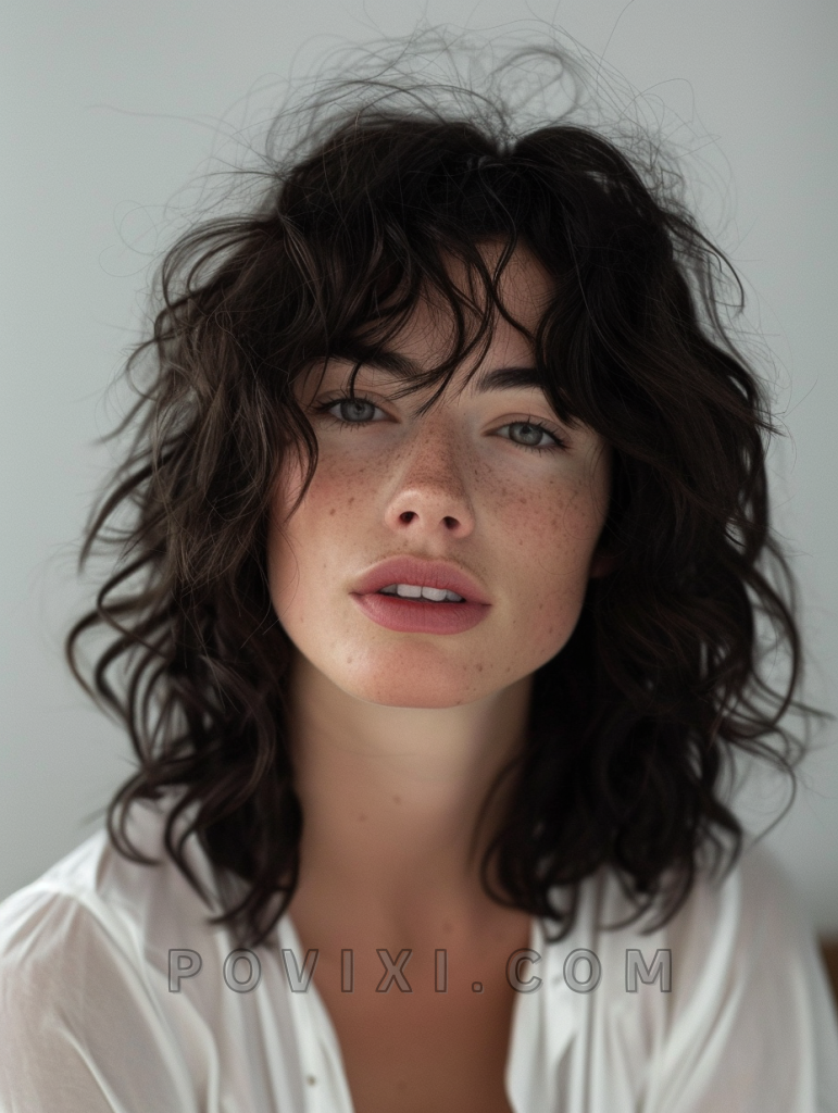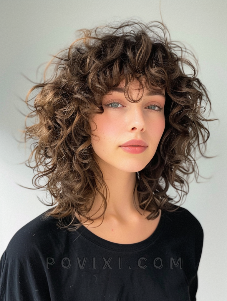 The Curly Shag with Curtain Bangs brings a retro flair back into the spotlight, perfectly blending the wild spirit of the shag cut with the softness of curtain bangs. This haircut is ideal for those with medium to long natural curls and works exceptionally well for individuals with oval or square face shapes, as the bangs soften the facial contours. This versatile look is suitable for both casual outings and more dressed-up events.