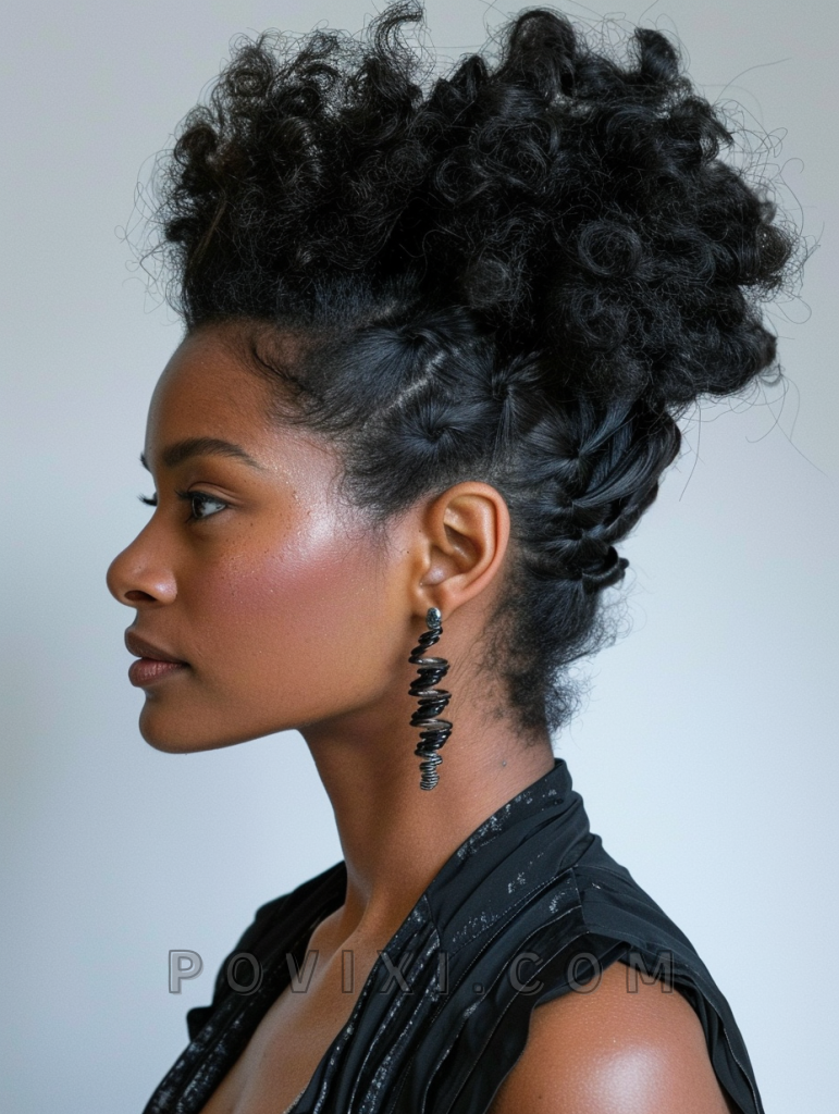 A bold expression of curly hair, the Spiral Frohawk concentrates curls into a striking mohawk while the sides are either closely cropped or sleekly styled. This daring style is best for those with tight, natural curls and suits a variety of face shapes, particularly highlighting angular features. It’s a standout choice for special occasions or artistic events where making a visual impact is desired.