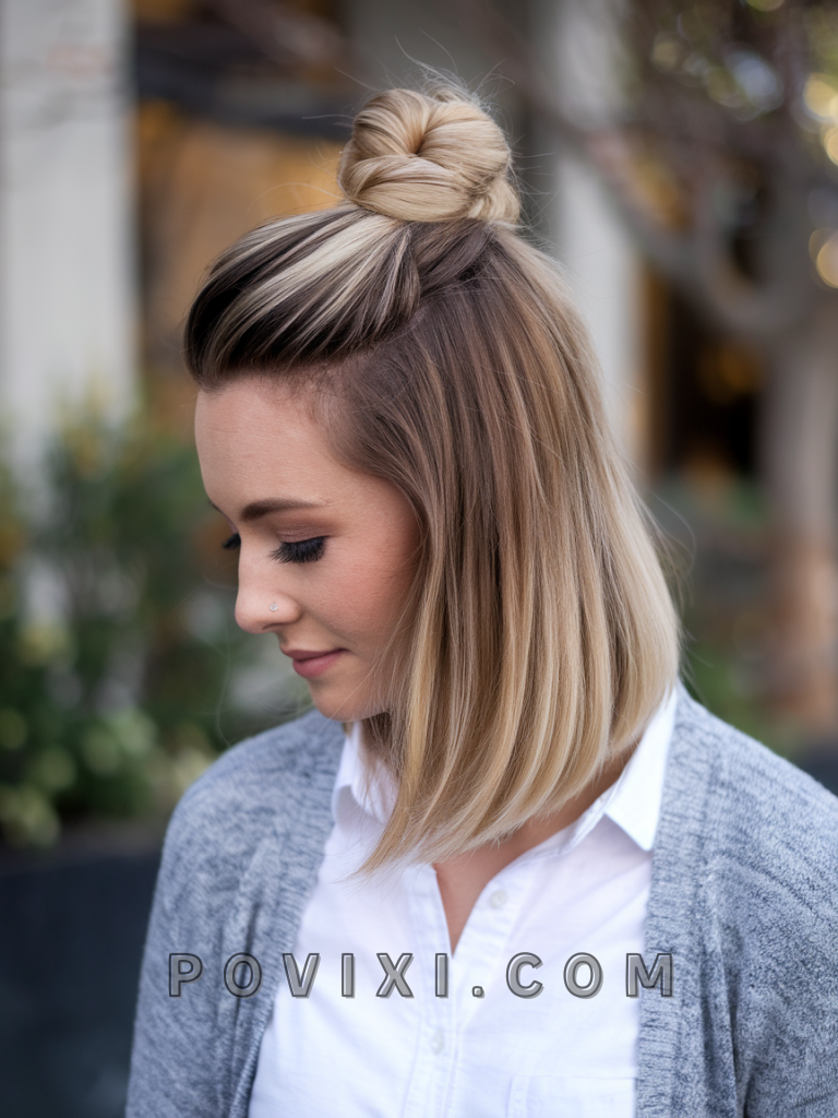 The half up half down bun is a versatile hairstyle for school, a casual Christmas party, or even a day at the beach. It’s ideal for medium-short hair and suits all face shapes. This look combines the charm of loose waves with the practicality of a secure bun, making it perfect for balancing elegance and functionality.