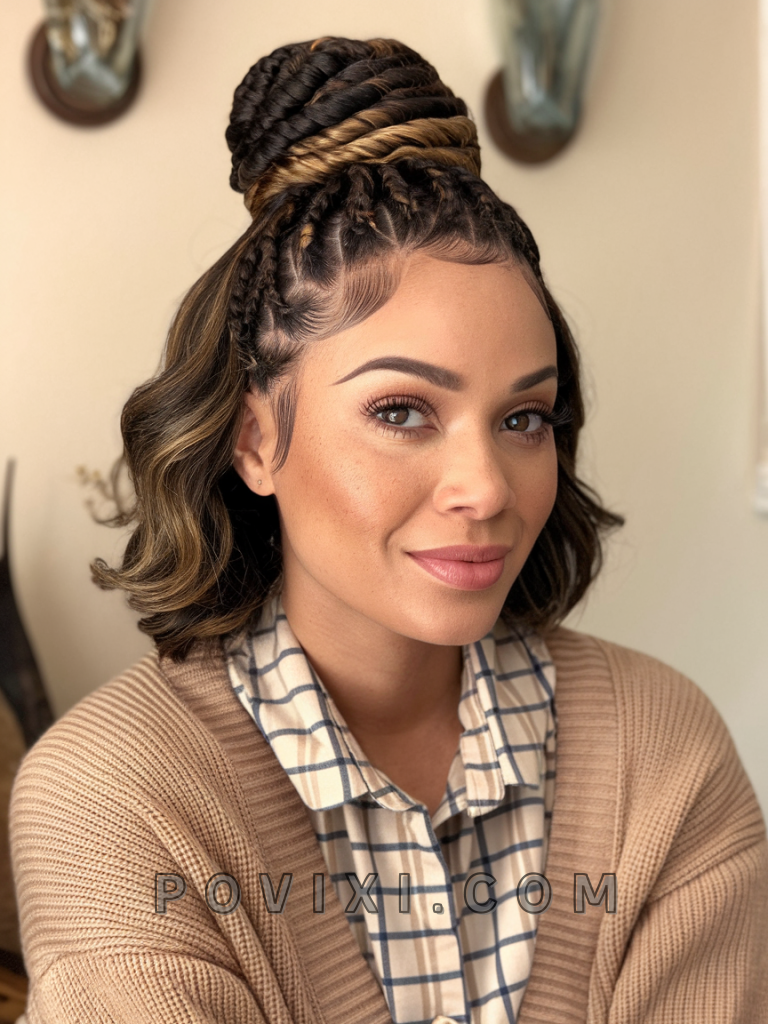 A short braided updo is both practical and stunning, ideal for weddings, prom, or any formal occasion. This style is especially suitable for black women looking for an elegant yet protective hairstyle. It frames oval and heart-shaped faces beautifully while keeping hair away from the neck.