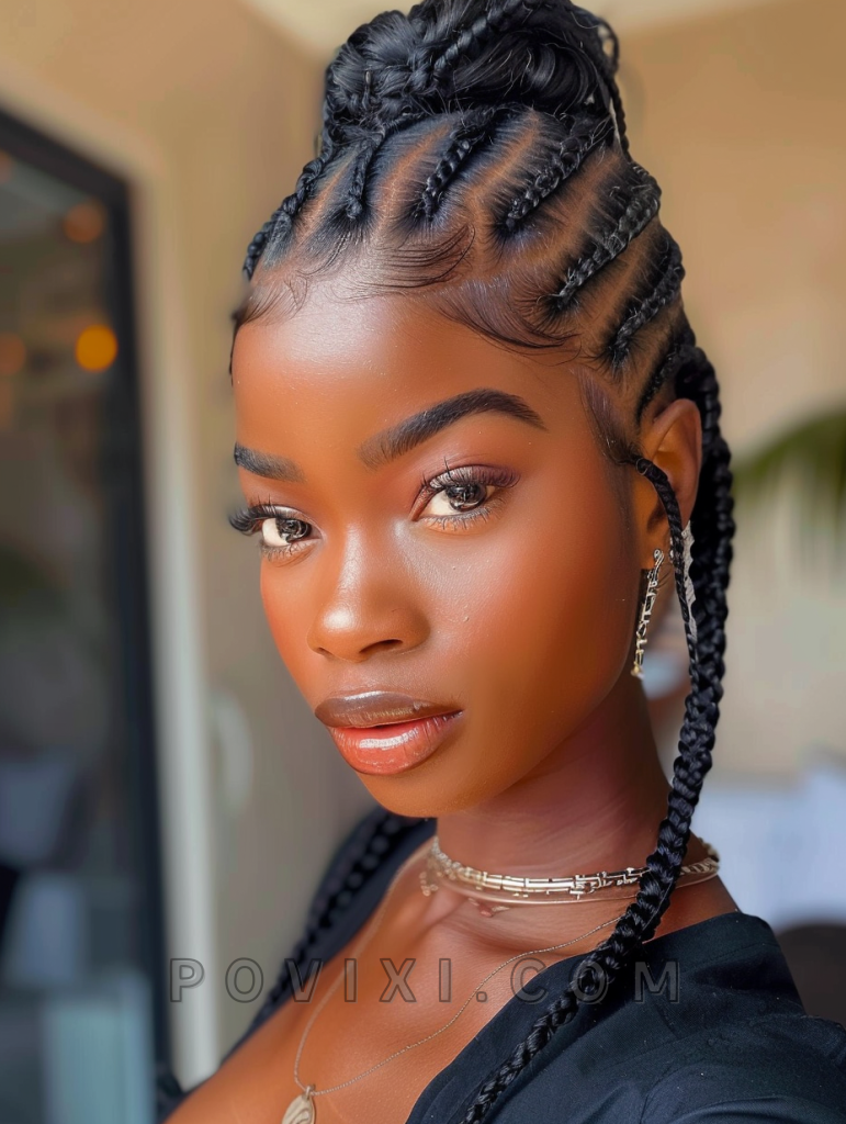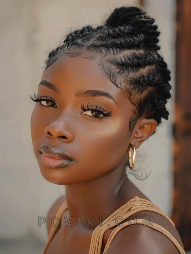 Cornrow braids are a timeless protective style that works wonderfully on short natural hair. This style involves braiding the hair close to the scalp in neat, straight lines, creating a sleek and tidy appearance. Simple cornrows are perfect for both casual and formal occasions, making them a versatile choice. They suit all face shapes and highlight your natural features beautifully, particularly enhancing darker eye colors with their bold lines.