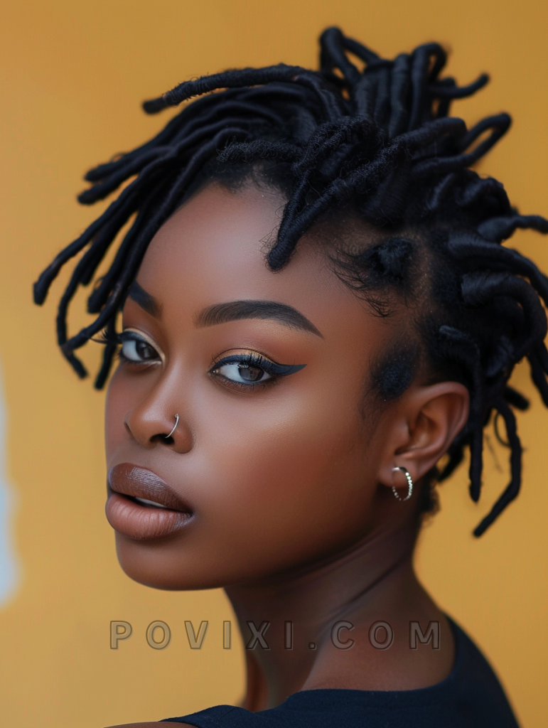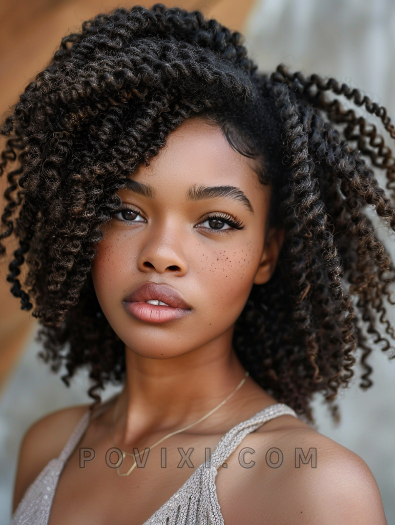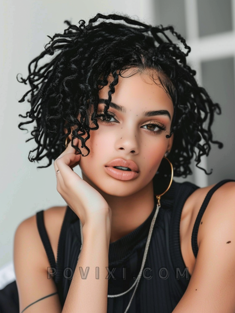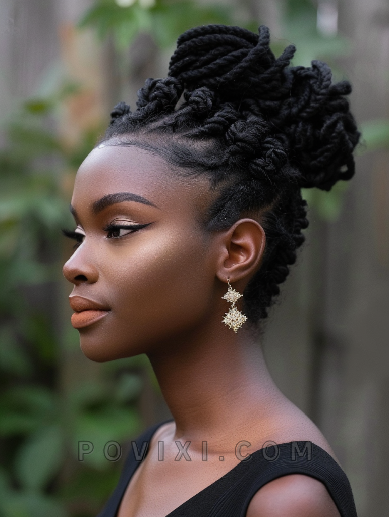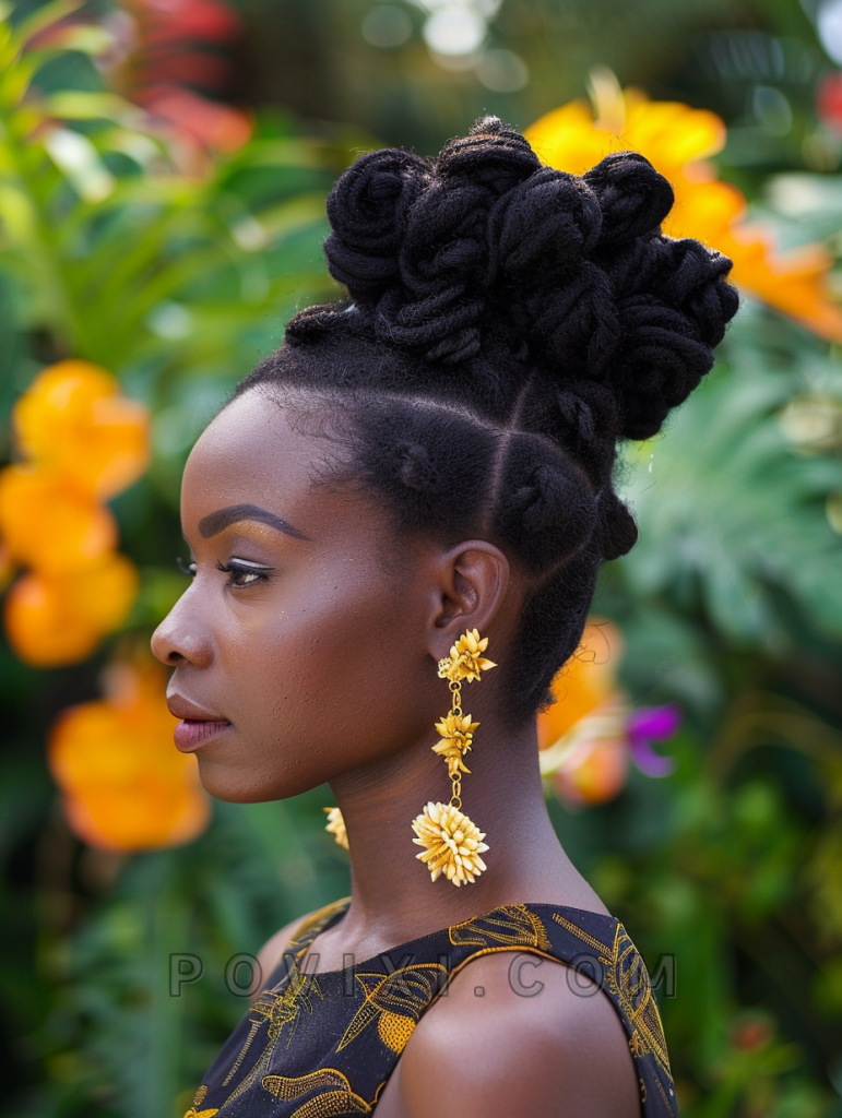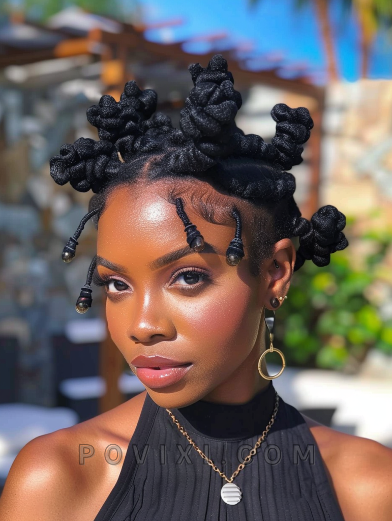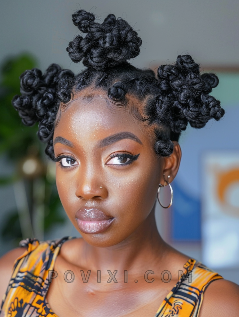 Bantu knots are a protective and visually striking hairstyle that works beautifully on short natural hair. This style involves sectioning the hair and twisting each section into a small knot. It’s perfect for both casual and formal occasions, suiting all face shapes and bringing out the vibrancy in eye colors like amber and green.
