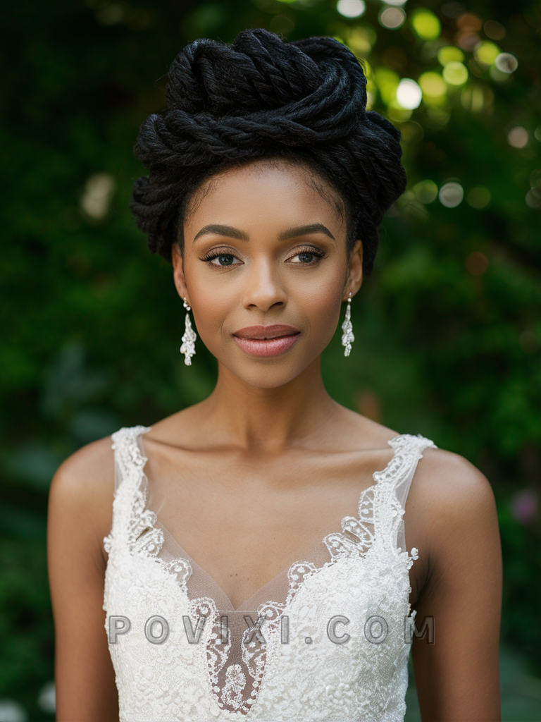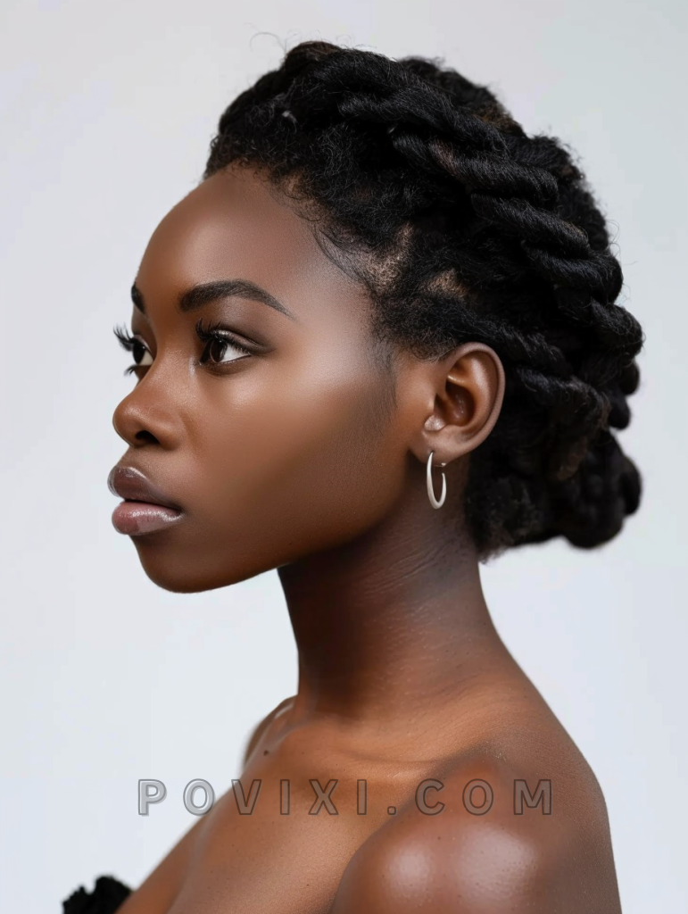 A quick braided updo is a stylish and easy hairstyle that adds an elegant touch to short natural hair. This look involves braiding sections of the hair upwards towards the crown, creating a voluminous updo that is both sophisticated and practical. It’s perfect for special occasions like weddings or formal events and suits heart-shaped and oval faces beautifully, enhancing eye colors such as blue and green.