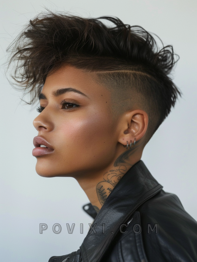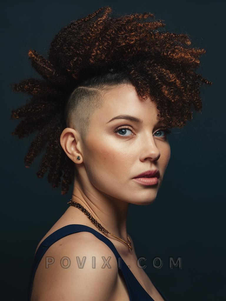 The mohawk with shaved sides is an edgy and trendy hairstyle that makes a bold statement. This style involves shaving the sides of your head while leaving the center section long and curly. It’s perfect for those who want to showcase their unique style, suiting heart-shaped and square faces, and enhancing darker eye colors.