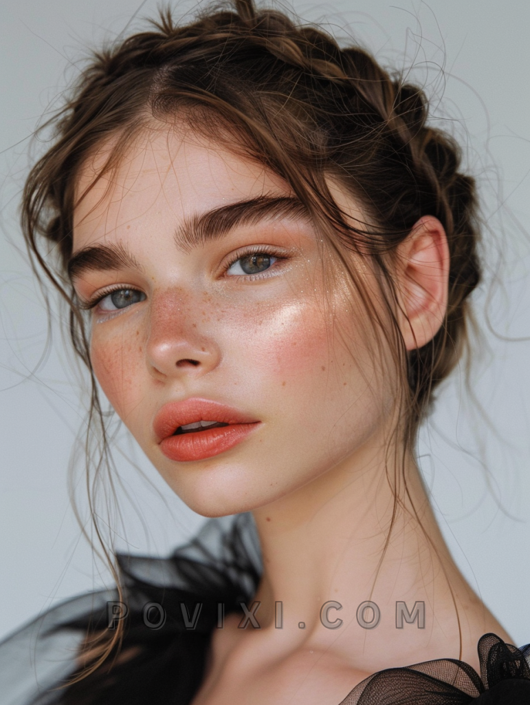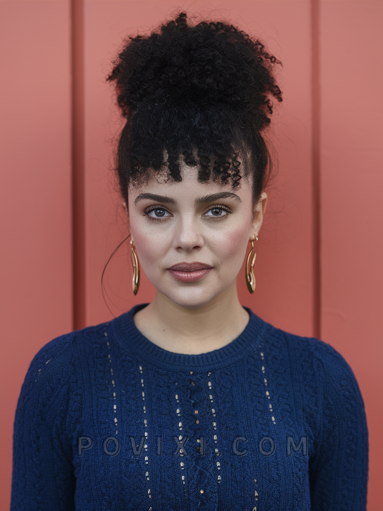 The high bun with curly bangs combines the elegance of a bun with the playful texture of curly bangs. This style is perfect for both casual and formal occasions, suiting all face shapes and highlighting eye colors like brown and hazel.