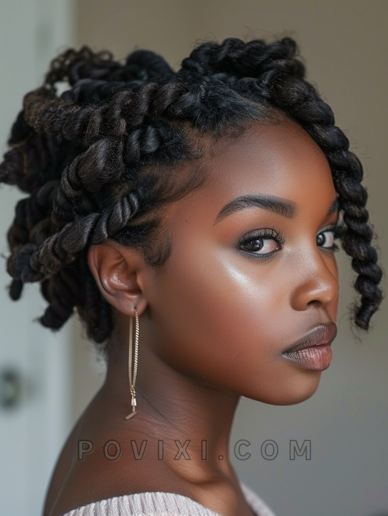 Twist-outs are a popular protective style that adds definition and volume to short natural hair. This style involves twisting small sections of hair, allowing them to set, and then unraveling them to reveal beautifully defined curls. Twist-outs are perfect for casual and semi-formal occasions, suiting all face shapes and bringing out the brightness in eye colors like amber and green.