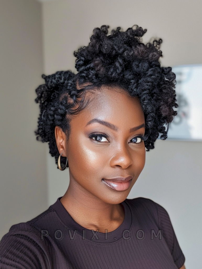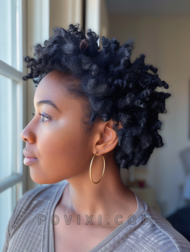 Finger coils are a fantastic way to define your natural curls without the use of gel. This style involves coiling small sections of hair around your finger to create uniform, bouncy curls. It’s a simple yet effective method that works well for short natural hair, especially for those with 4c hair. Finger coils are great for casual outings and give a youthful, playful look, suiting all face shapes and bringing out the depth in darker eye colors.