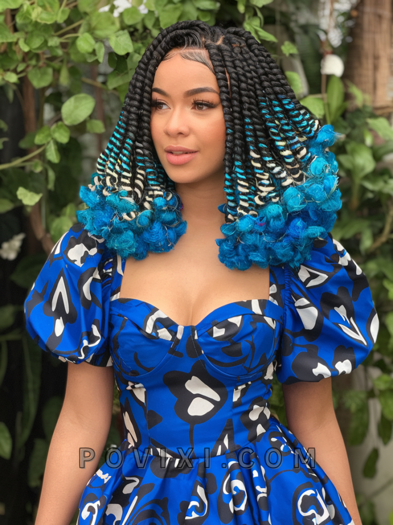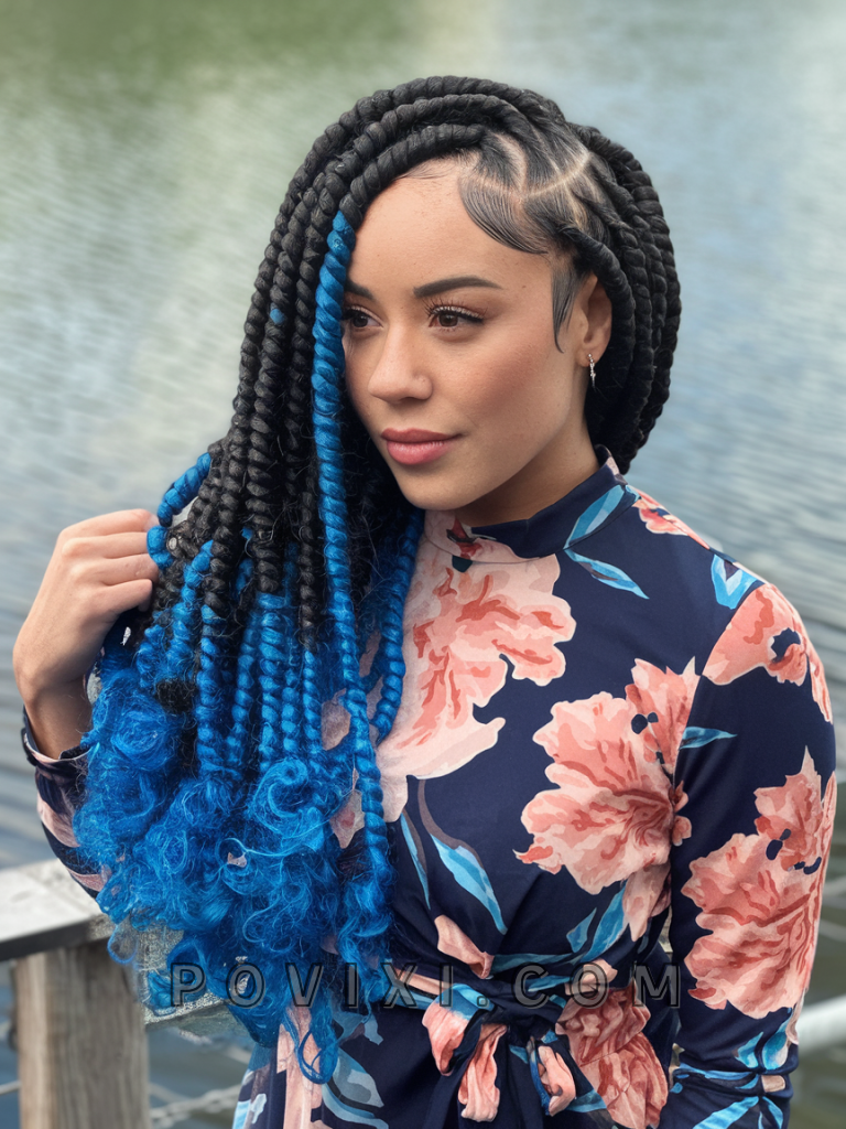 Use blue extensions to intersperse with black hair for a striking contrast. A high-quality twisting cream ensures smooth and frizz-free twists. Maintain vibrancy by using a color-safe shampoo and avoiding prolonged sun exposure.