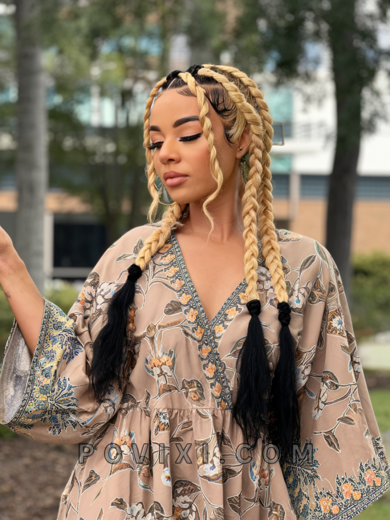 Blonde and black Goddess twists are a bold and dynamic option for anyone seeking a standout look. This style works well for upscale events or fashion-forward outings, suiting oval and square face shapes. The dramatic contrast of color blonde and black highlights all eye colors beautifully.