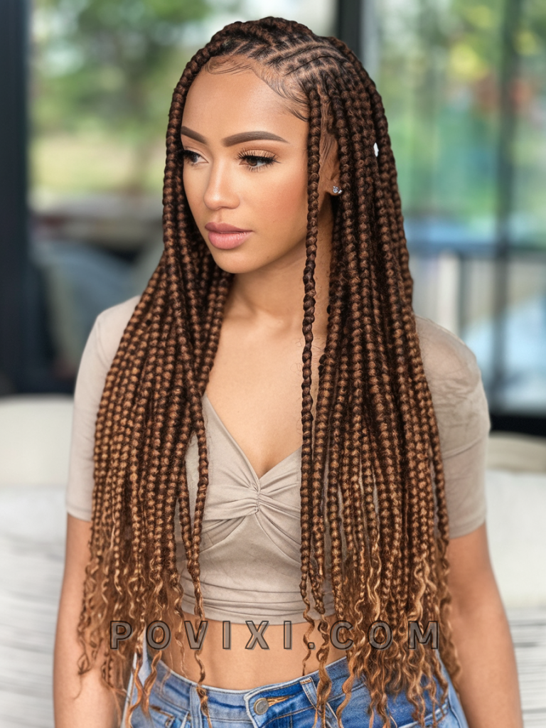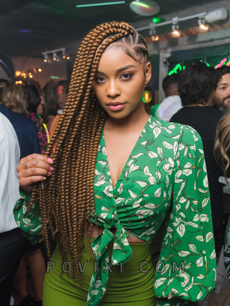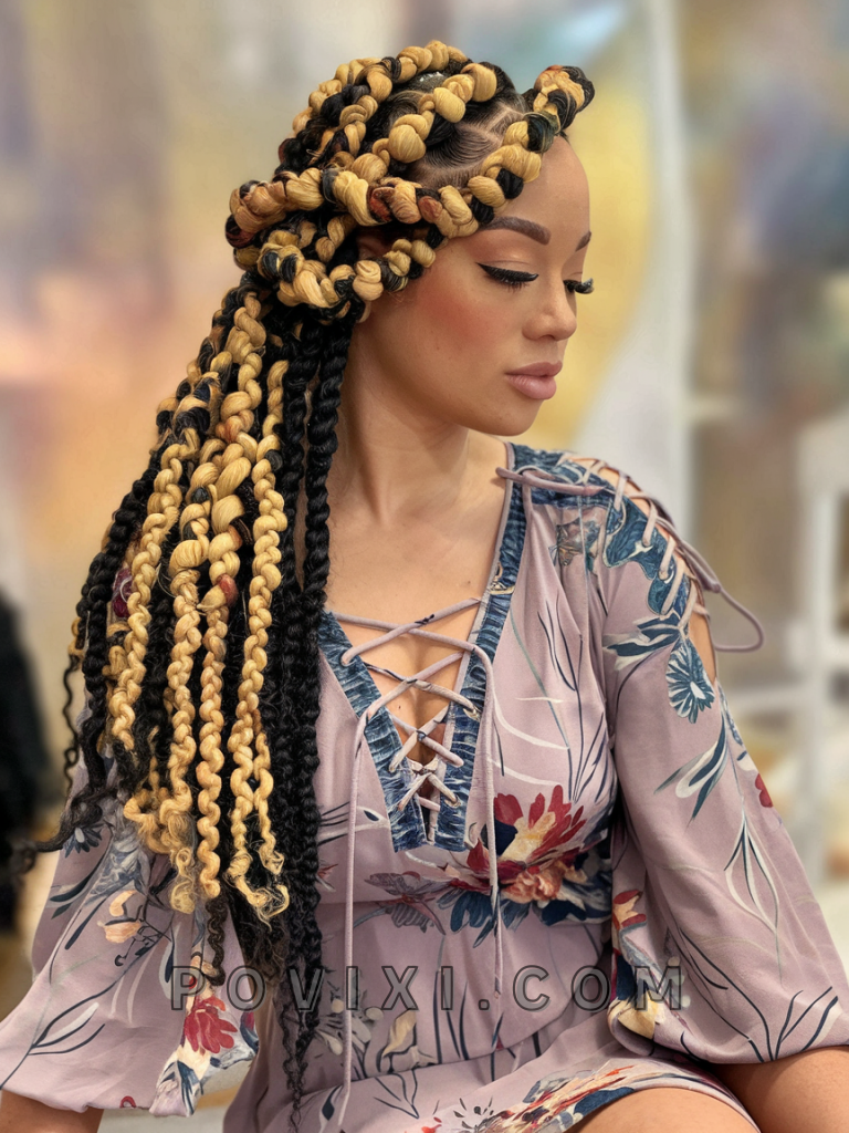 For a touch of bohemian elegance, blonde and black twists are a standout choice. Combining two striking tones, this style works well for those seeking a bold, trendy look. The contrast between color blonde and black adds depth, making it ideal for social events or boho-themed photoshoots. This style flatters diamond-shaped faces and enhances blue or green eyes.