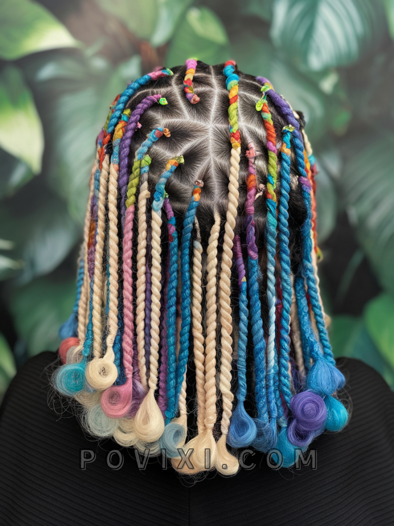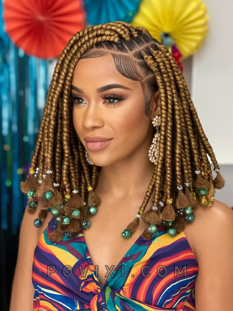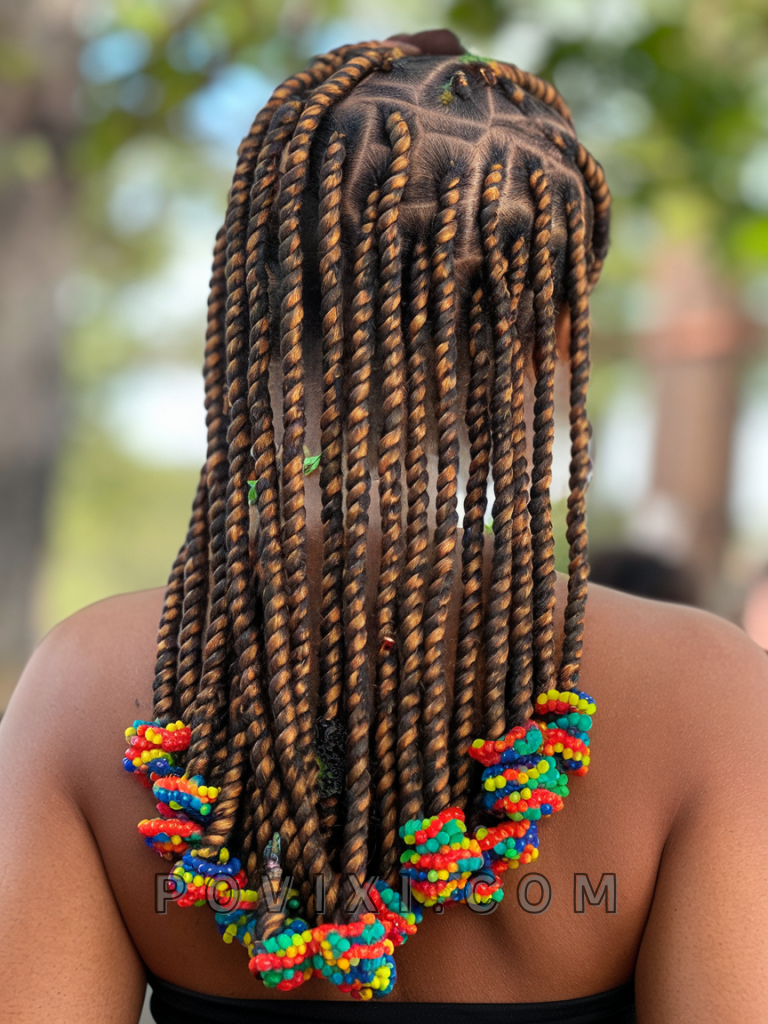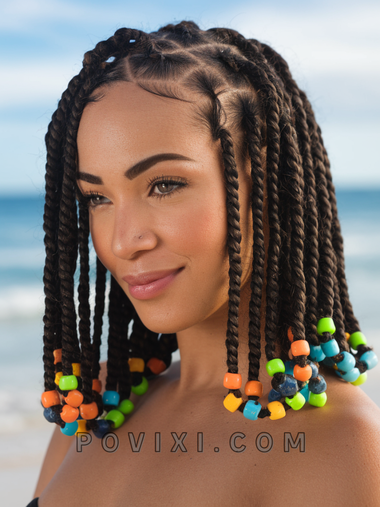 Island twists adorned with colored beads are perfect for making a playful statement. This style combines intricate twists with vibrant beads that dangle elegantly, adding flair to casual outings, summer festivals, or even beach weddings.  The hairstyle works beautifully for kids and adults alike, complementing oval and heart-shaped faces. Bright beads in shades of blue and blonde and black add an eye-catching finish, especially for those with dark or medium brown hair tones.