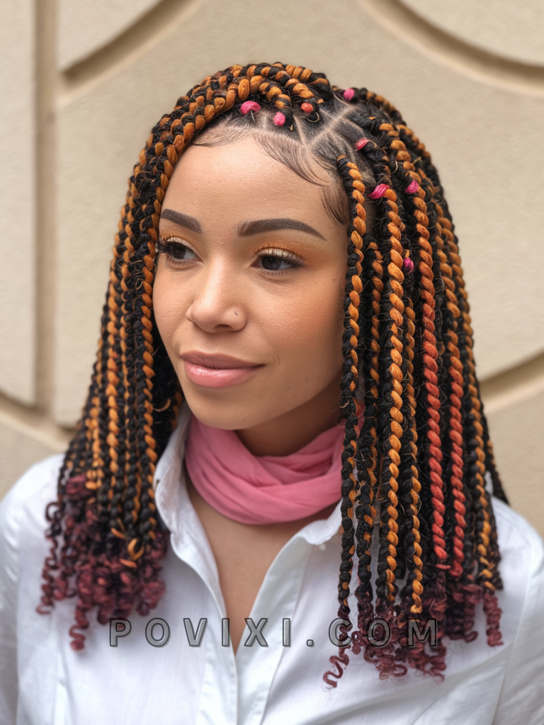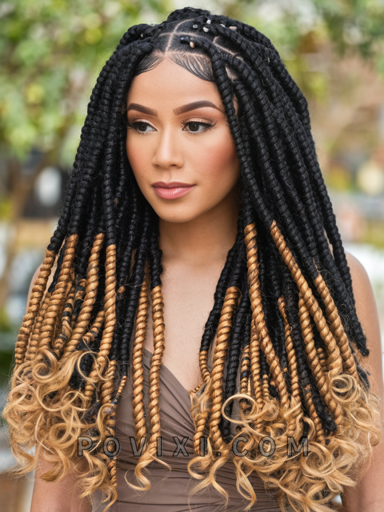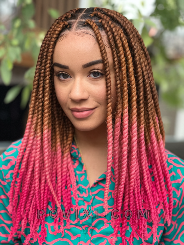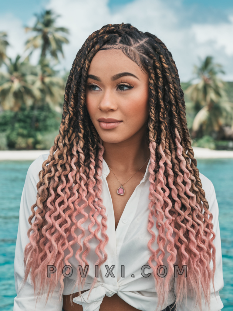 Ombre Island twists feature a seamless color gradient, transitioning from dark brown at the roots to color blonde or even pastel hues at the tips.  This versatile style works beautifully for formal events, casual outings, and even weddings. It complements oval and heart-shaped faces, and the gradient effect enhances light or hazel eyes.