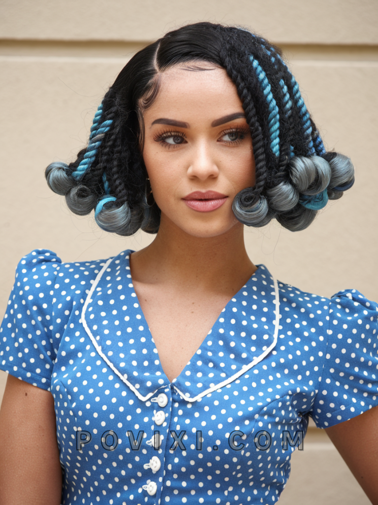 To create this look, incorporate thin extensions in blue shades into your twists. Use a detangling brush and a twisting cream for a smooth finish. Refresh the style with a hydrating mist to keep the twists lively.