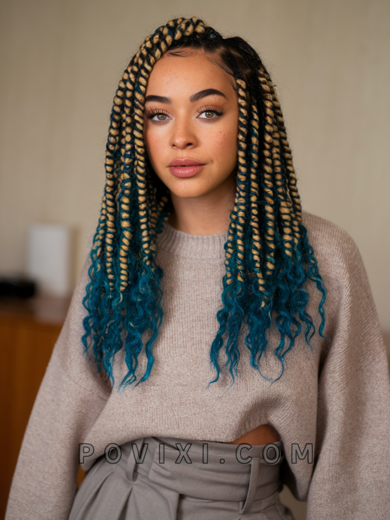 For a daring look, combine shades of blue and black in your Island twists. This bold style is perfect for festivals, concerts, or creative photoshoots. It flatters heart-shaped faces and enhances cool-toned eye colors like blue or gray.