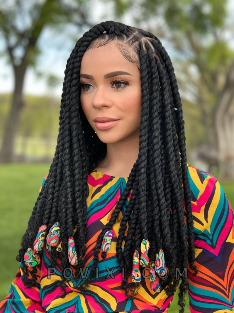 Taking cues from the Lemonade braids trend, this style offers a sleek and dramatic twist look. These twists are asymmetrical, cascading to one side for a stunning effect. Ideal for special occasions or photoshoots, this style suits oval and diamond-shaped faces.