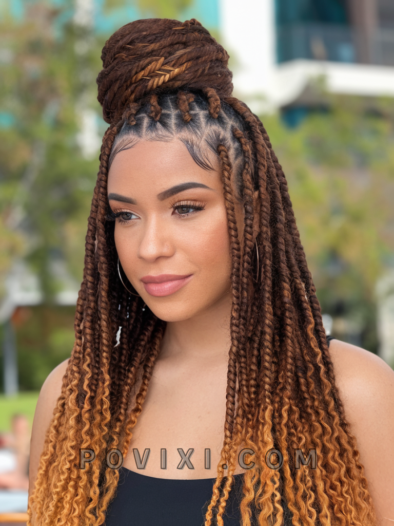 Ombre Island twists feature a seamless color gradient, transitioning from dark brown at the roots to color blonde or even pastel hues at the tips.