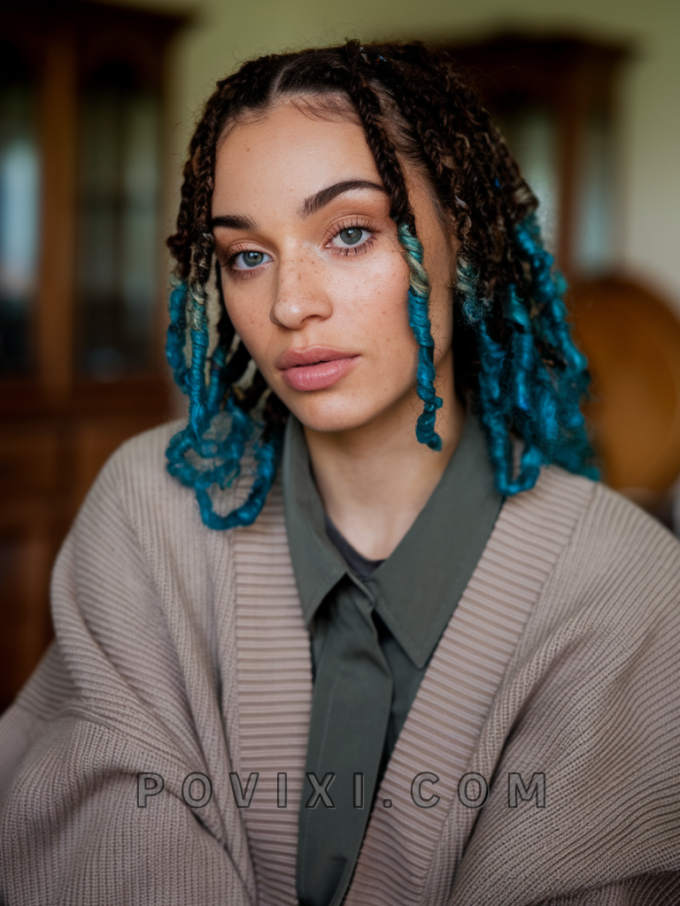 Small twists with streaks of blue offer a subtle yet striking way to experiment with color. This look is great for casual wear or creative photoshoots and suits oval and diamond-shaped faces. The bold highlights enhance cool-toned eye colors like gray or blue.