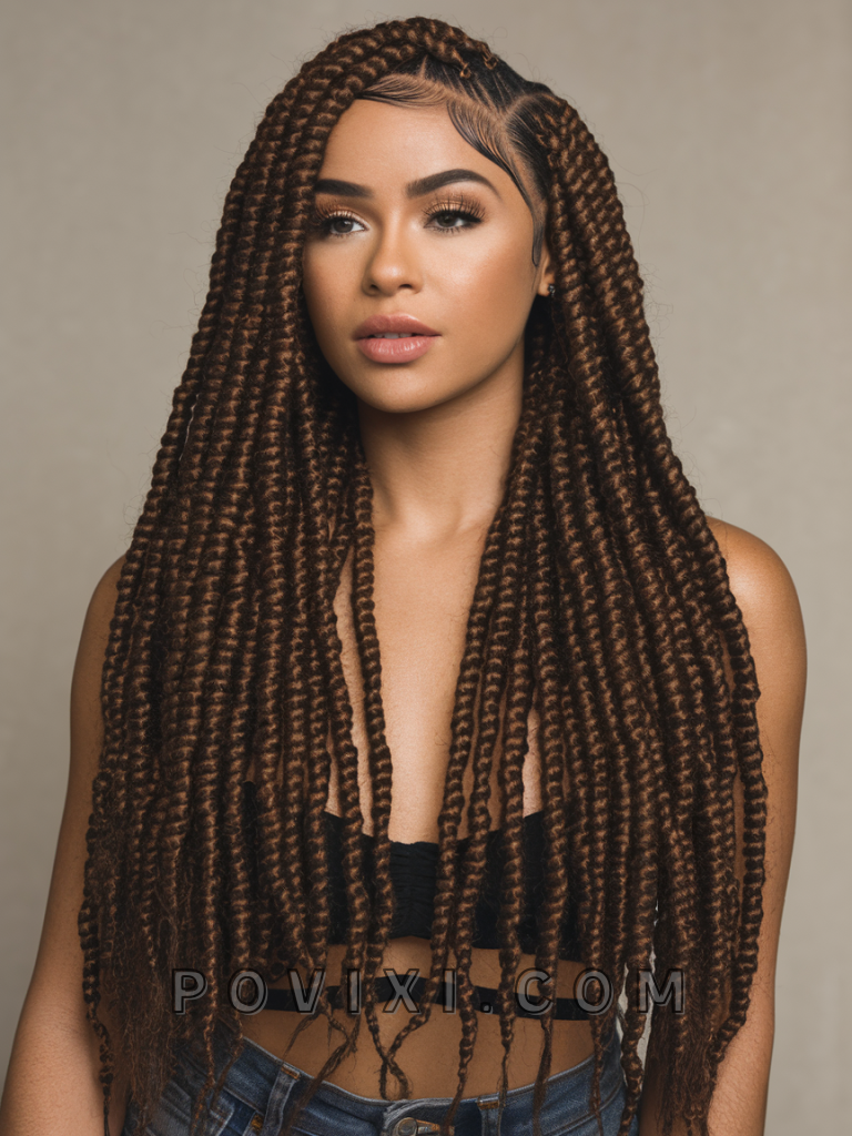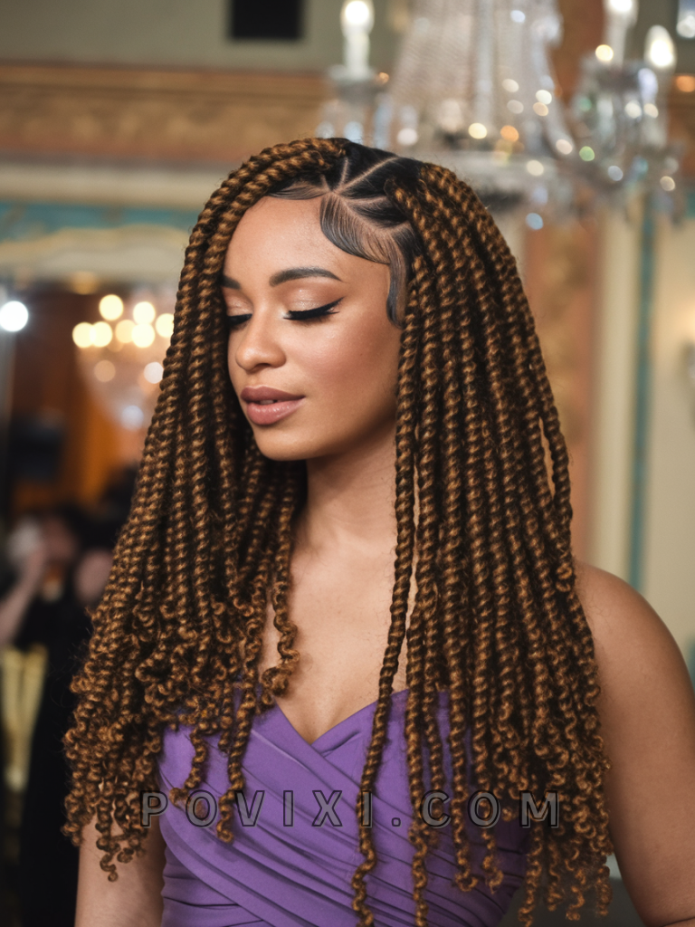The Goddess twists style offers a regal, polished look without the complexity of curls. These twists are larger and looser, giving an effortlessly elegant vibe perfect for formal dinners or upscale gatherings. This hairstyle best suits rectangular or oval faces and highlights dark or color brown hair beautifully.