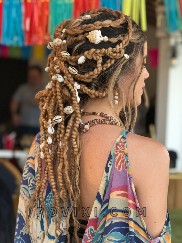 Island twists adorned with colored beads are perfect for making a playful statement. This style combines intricate twists with vibrant beads that dangle elegantly, adding flair to casual outings, summer festivals, or even beach weddings.