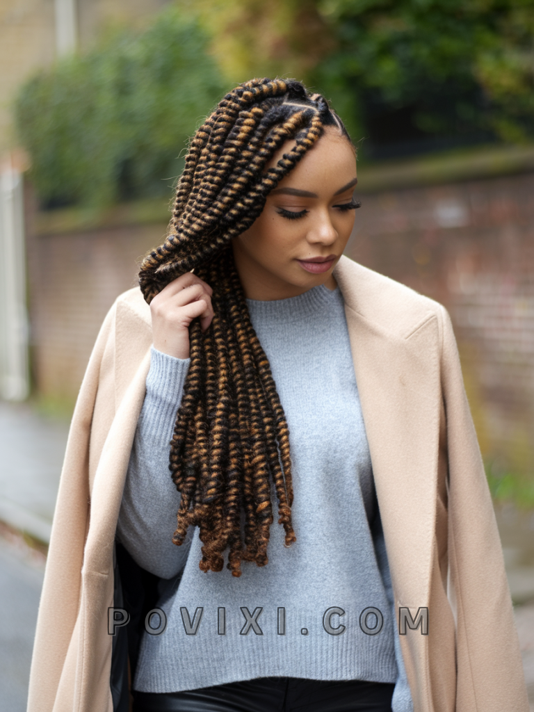To achieve this look, use extensions in two colors, alternating twists for a seamless blend. You’ll need a twisting comb, sectioning clips, and a moisturizing twist cream. Regularly mist the twists with a hydrating spray to keep them fresh and shiny.