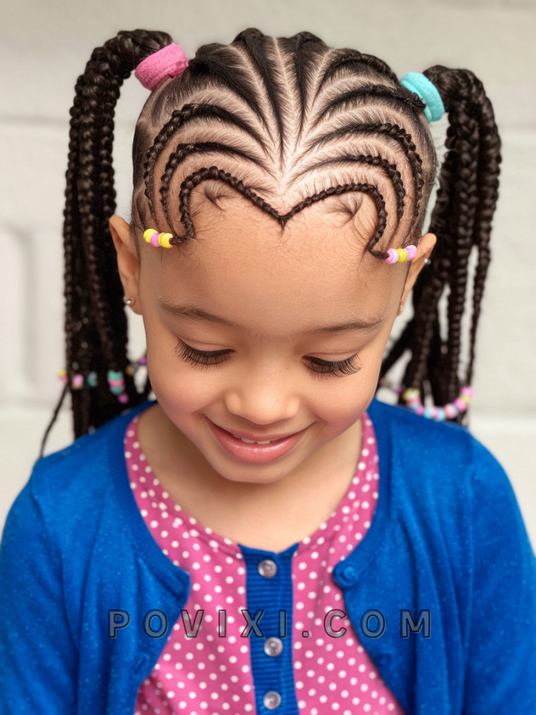 A playful yet elegant hairstyle, heart-shaped cornrows feature braided patterns that form intricate heart designs. This style is ideal for school events, birthday parties, or even a day out with family.