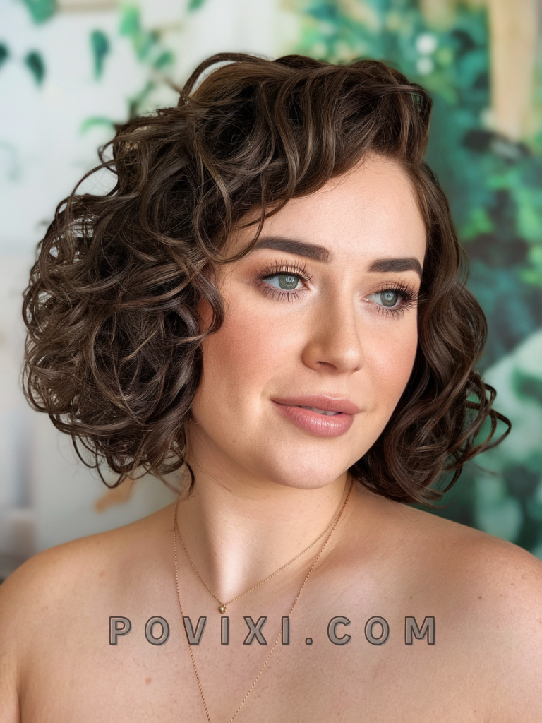 For a playful and manageable option, short layered curls with curtain bangs are a standout choice. The short length enhances your natural curl pattern while the bangs frame your face, emphasizing your cheekbones and eyes. This style is perfect for busy mornings or casual outings and suits a round face beautifully.