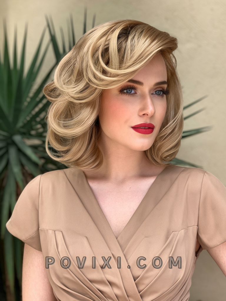Blonde, medium-length curls with a soft fringe bring a youthful, chic touch to your look. The fringe frames the face, drawing attention to your features, while the layers enhance the curl’s natural bounce. This style is ideal for casual or semi-formal occasions, complementing round or oval face shapes.