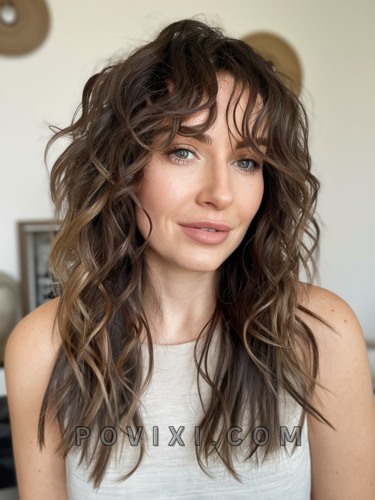 Long Curly Layers with Curtain Bangs