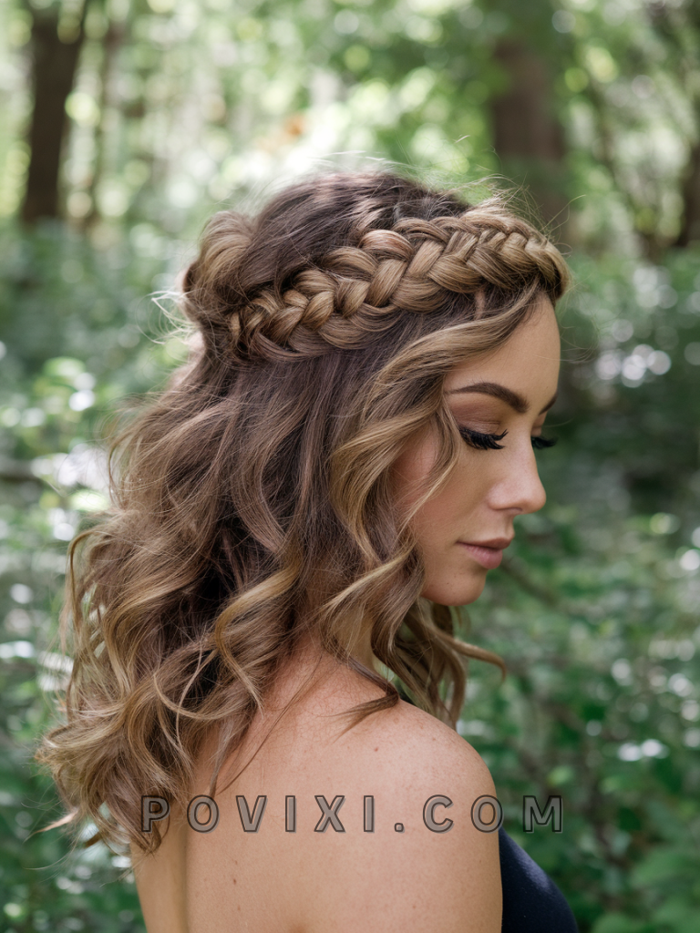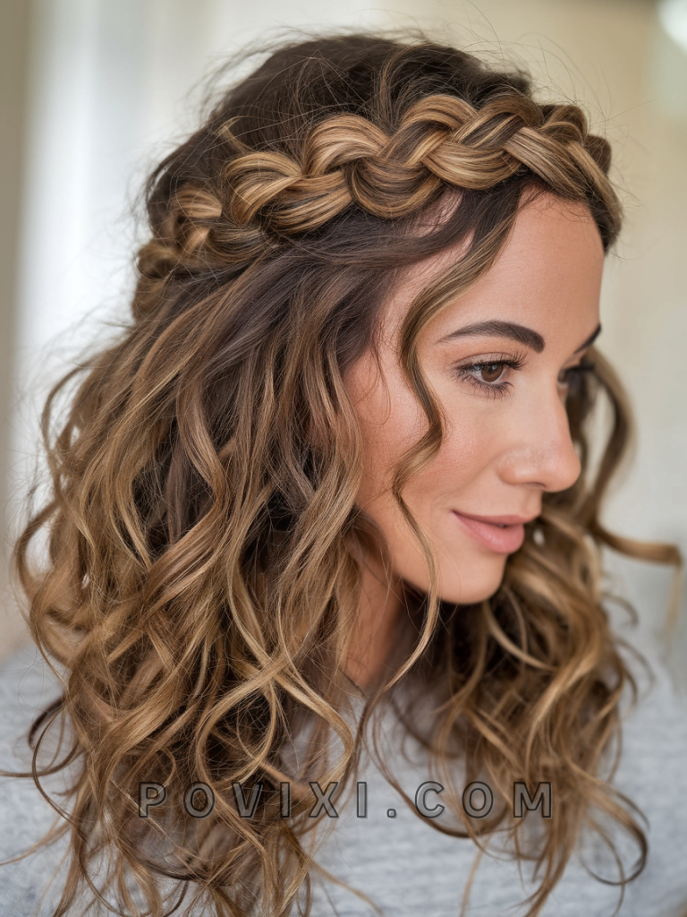 Layered curls paired with a braided crown create a romantic, bohemian style. This look is perfect for weddings, outdoor events, or music festivals. It enhances volume and is ideal for medium hair lengths and all curl types, particularly 3a and 3b.