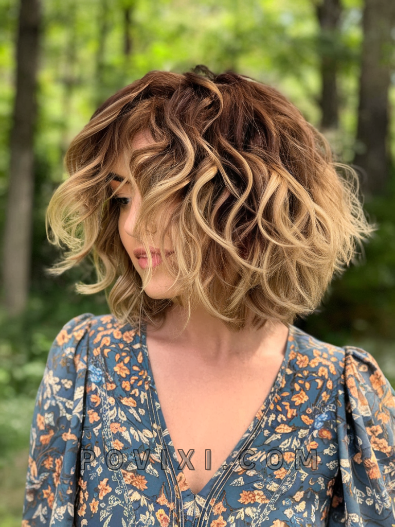 A medium-length layered cut paired with an ombre coloring technique creates a vibrant, dynamic effect. The layers enhance the curl pattern, while the ombre adds dimension and brightness, particularly for blonde or caramel tones.