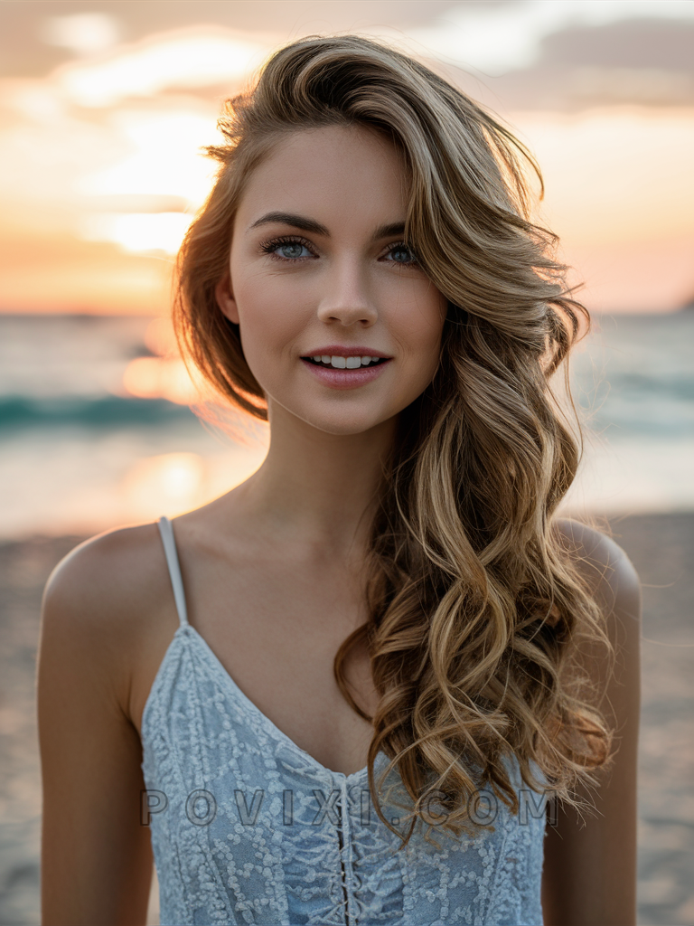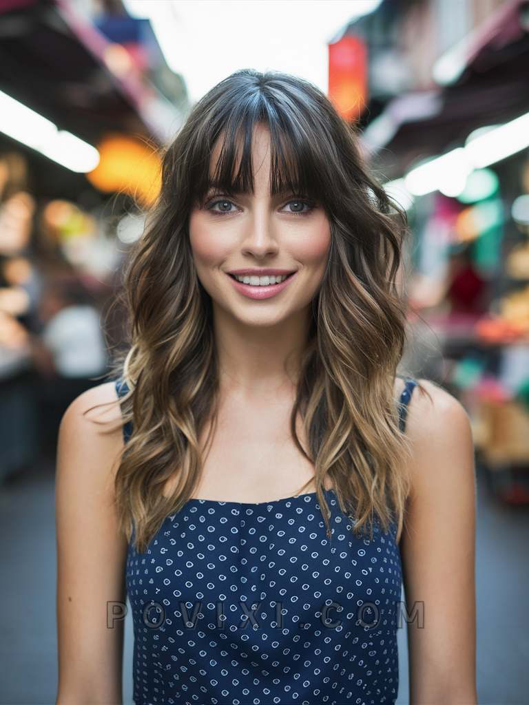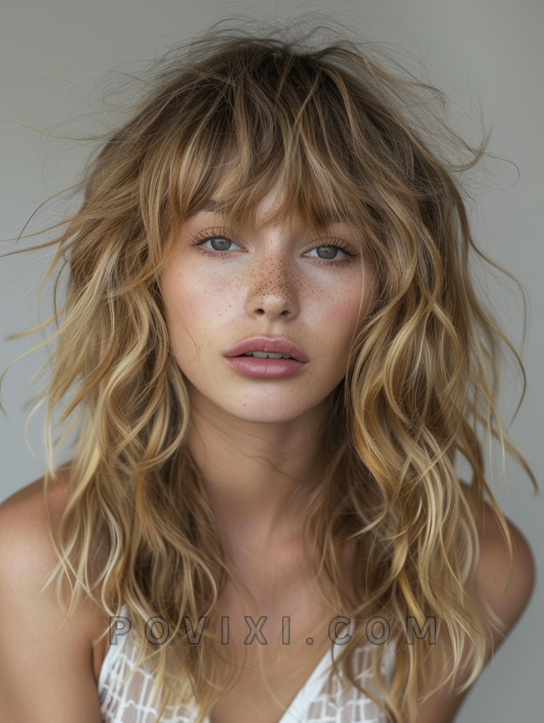 Wavy beachy hair with bangs is a trendy and laid-back style that’s perfect for summer. The waves add texture and movement, while the bangs frame the face and add a playful touch. This style is ideal for those with a hair wavy loose curls beach texture and works well for all face shapes.