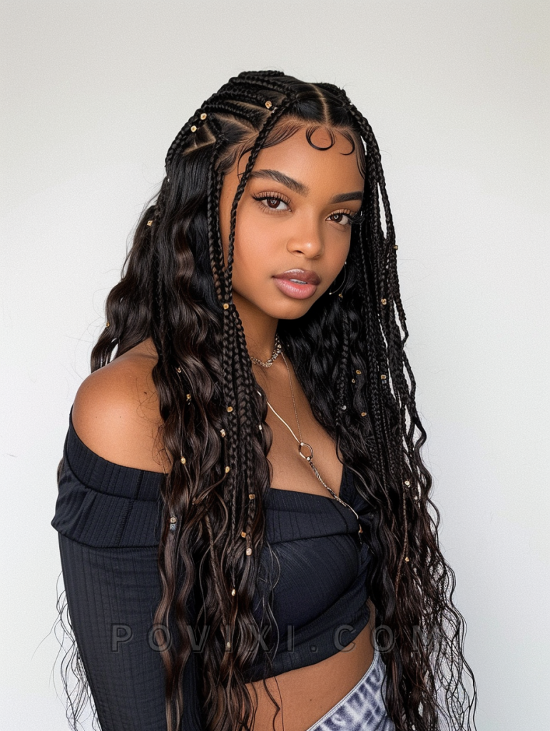 Long layered waves with boho braids create a whimsical and free-spirited look that’s perfect for festivals or casual outings. The waves add texture and movement, while the boho braids add intricate detail. This style is ideal for those with naturally wavy or curly hair.